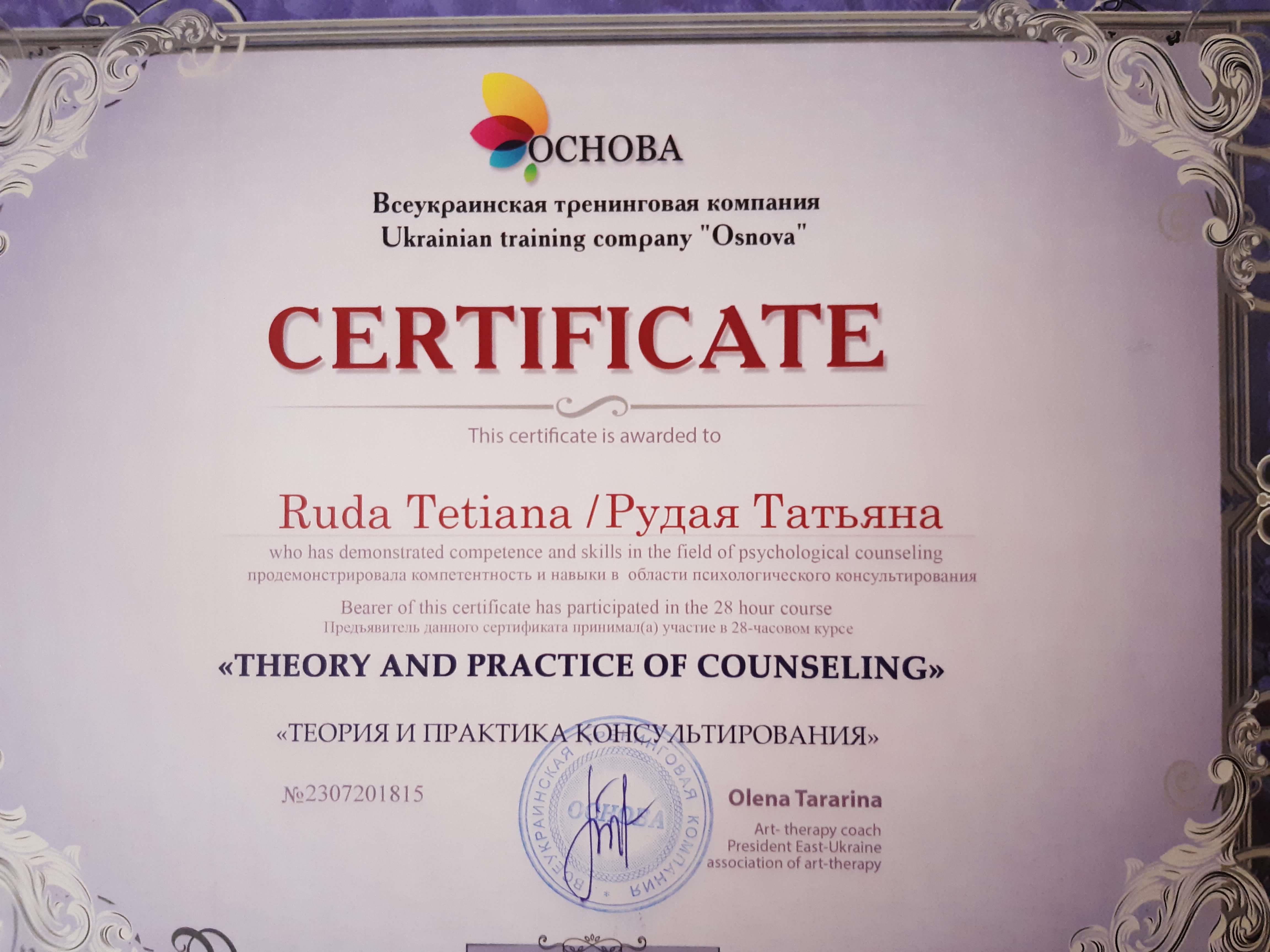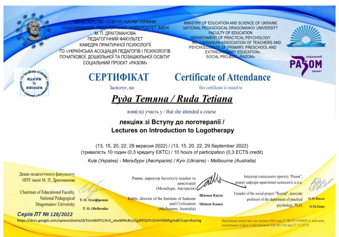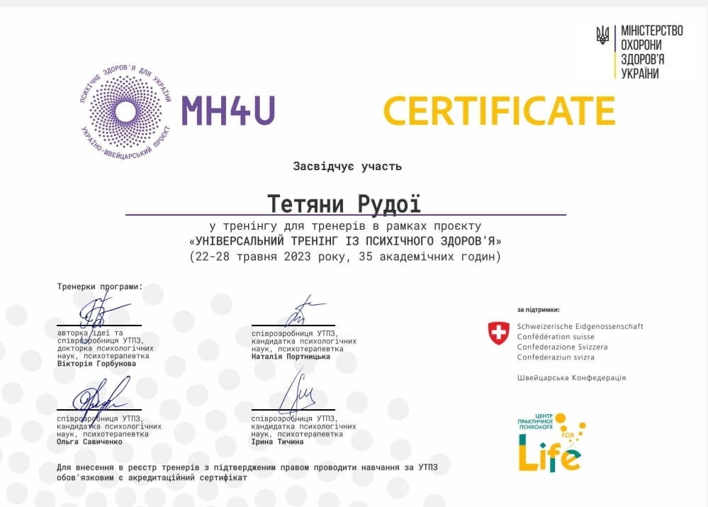 Емпатичність, чуйність, професіоналізм, ті якості, які мають бути притаманні кожному психологу. Постійно розвиваю їх у собі, прагну до професійного та особистісного зростання. Психолог соціальних проектів "Разом" та "Ранні пташки". Модератор фінансово-психологічної гри "Психологія грошей". Тренер програми для підлітків "Профілактика кризової поведінки".