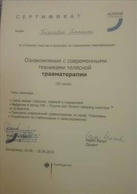 2016, 2018 – взяла участь у семінарі "Ознайомлення з сучасними техніками тілесної травмотерапії" 60 годин, тренера Карен Каоук та Ганс – Генманн Бертц EFT – Інститут Берлін;