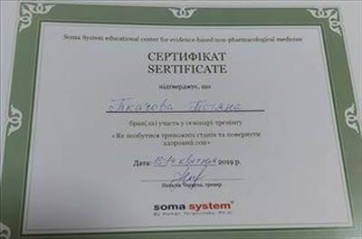2019 - взяла участь у семінарі - тренінгу - "Як позбутися тривожних станів та повернути здоровий сон" за методом SOMA SYSTEM;