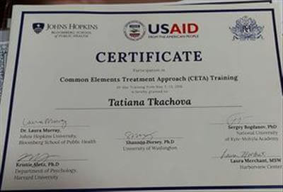 2016 - Common elements treatment approach (CETA) trainning на базі університету JOHNS HOPKINS, після 3 років спільної діяльності, отримала сертифікацію у 2019 році;