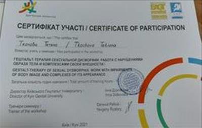 2021 - брала участь у семінарі "Гештальт - терапія сексуальної дисморфії. Робота з порушеннями образу тіла та комплексами своєї зовнішності" КДУ;