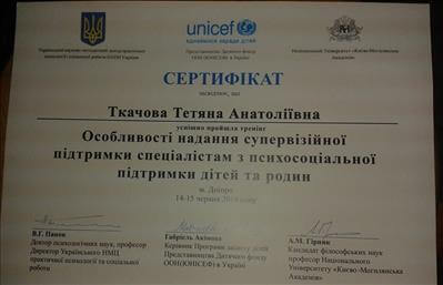 2016 - брала участь у тренінгу "Особливості надання супервізорської підтримки спеціалістам із психосоціальної підтримки дітей та сімей" UNICEF, тренер Тетяна Конрад;