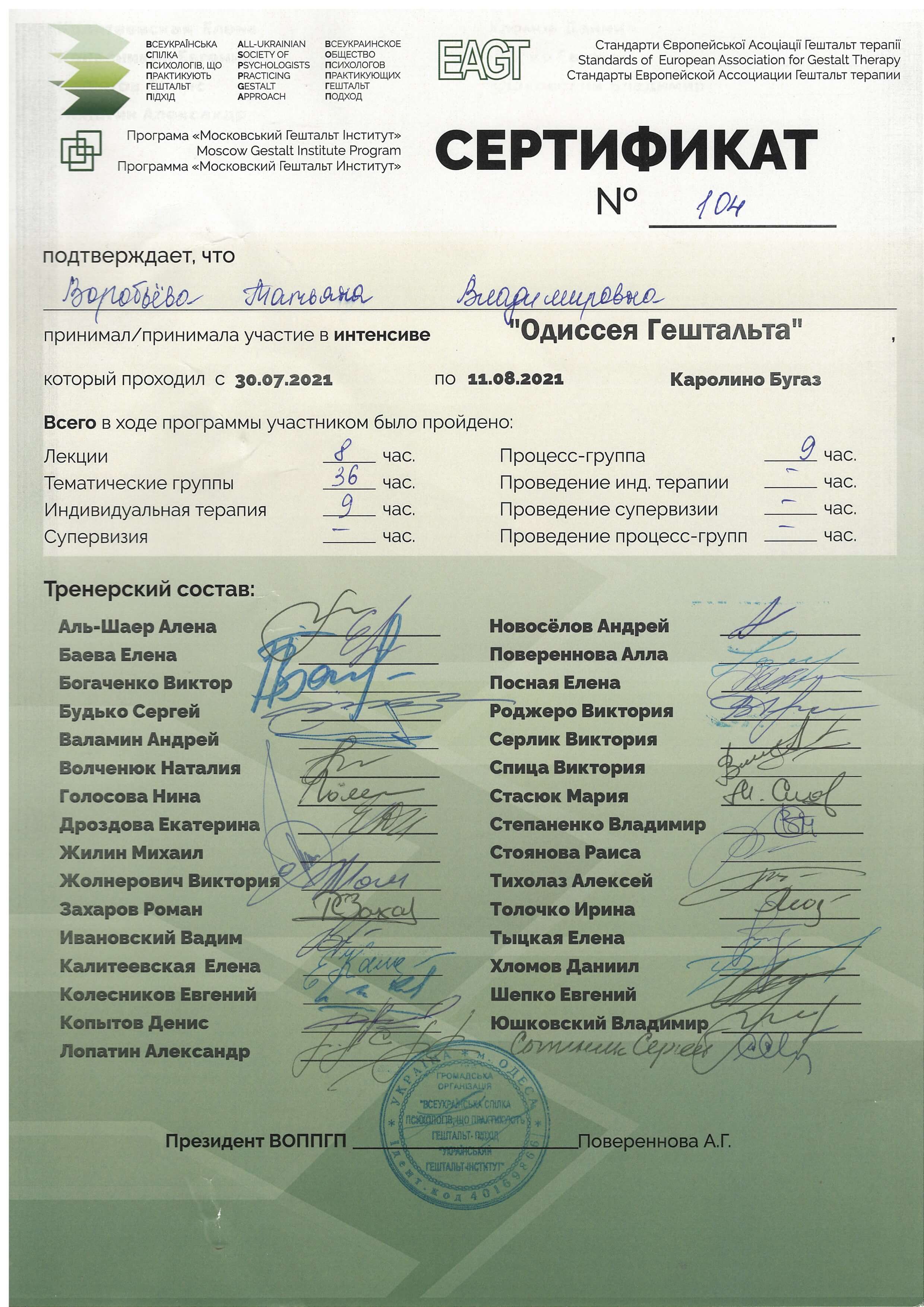 Психотерапія для мене особисто відкрила дорогу до себе, до своїх потреб та почуттів. Цей шлях був довгим і продовжується зараз, я працюю з особистим терапевтом та під супервізією. Психотерапія дозволила мені знайти мій шлях до більш повного та щасливого життя, що, безсумнівно, вплинуло на моє оточення, сім'ю, мою самореалізацію.