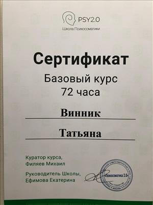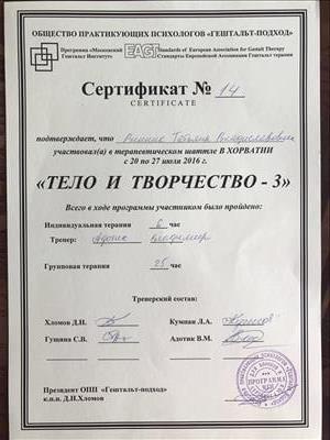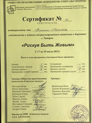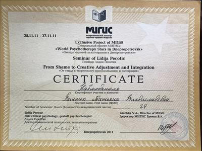 Протягом основного навчання проходила спеціалізації, Інтенсив, семінари, конференції та звичайно особиста терапія, які дозволили мені стати спеціалістом у моїй роботі з клієнтами.