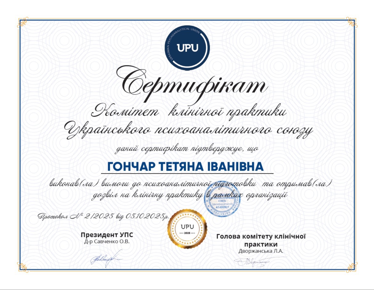 Маю ступінь магістра психології та поглиблене навчання в психоаналізі дорослих, дітей та підлітків. Та перш за все для мене важливо не лише мати диплом, але й глибоко розуміти цей шлях зсередини. Саме тому я пройшла (і продовжую проходити) власний психоаналіз та регулярні супервізії, бо переконана: терапевт може провести клієнта лише тим шляхом, який колись пройшов сам.
