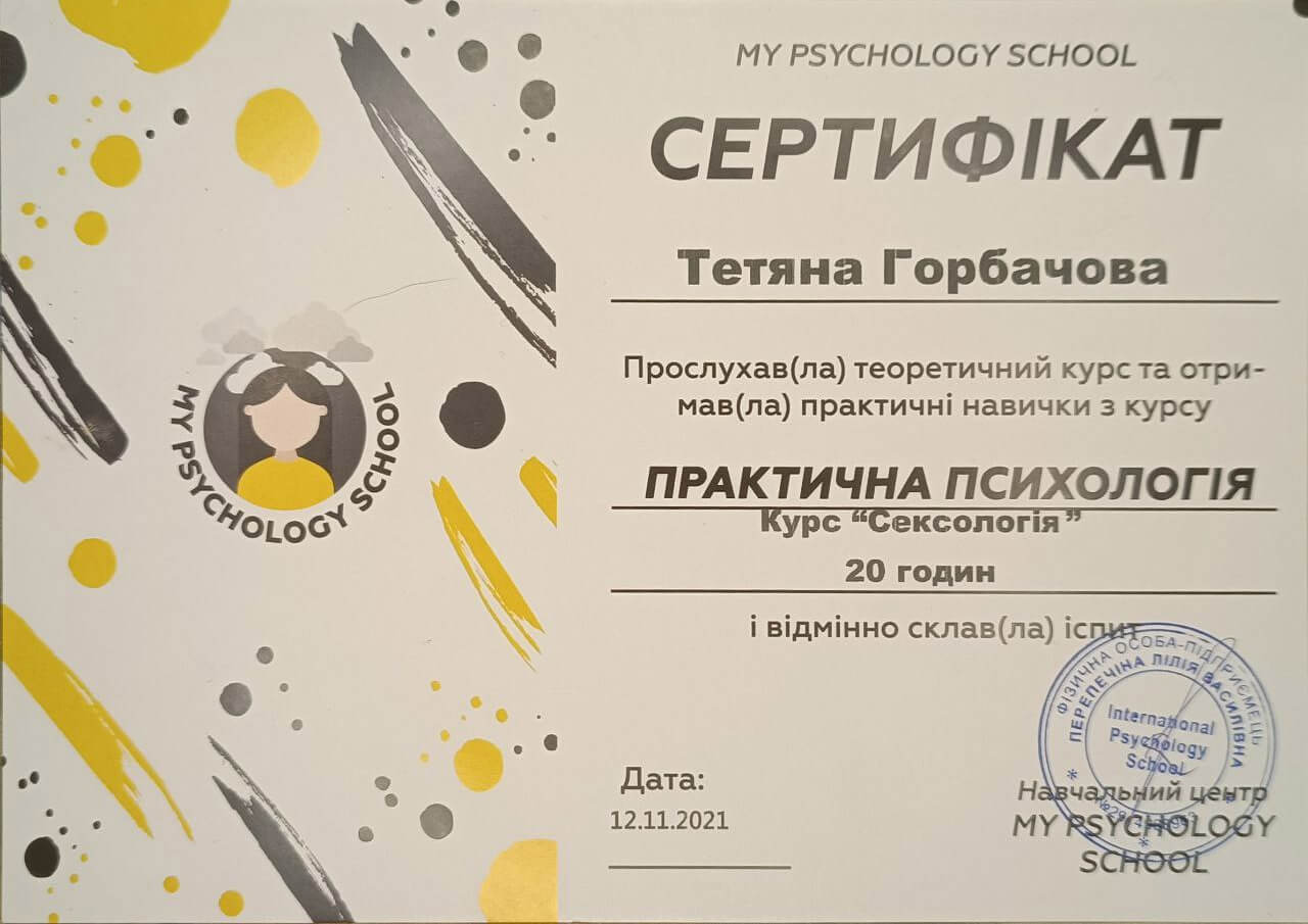 -Навчальний центр "My Psychology school" курс "Сексологія".