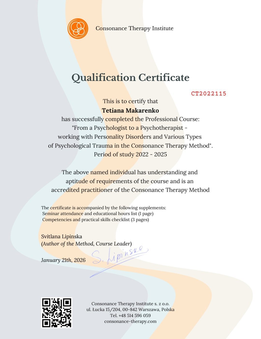 Також зараз навчаюся на психотерапевта у авторському методі Світлани Ліпінської - Consonanse Therapy (метод, орієнтований на роботу з різними видами психотравм).