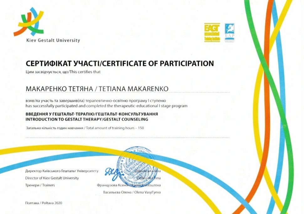 Зараз навчаюся на 2 ступені в Київському Гештальт Університеті (психотерапевт у процесі навчання).
