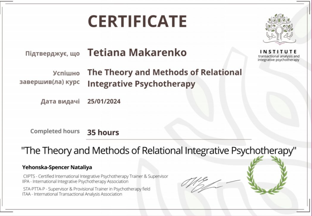 Пройшла базовий курс з Позитивної психотерапії. Маю рівень консультанта у методі Позитивна психотерапія.