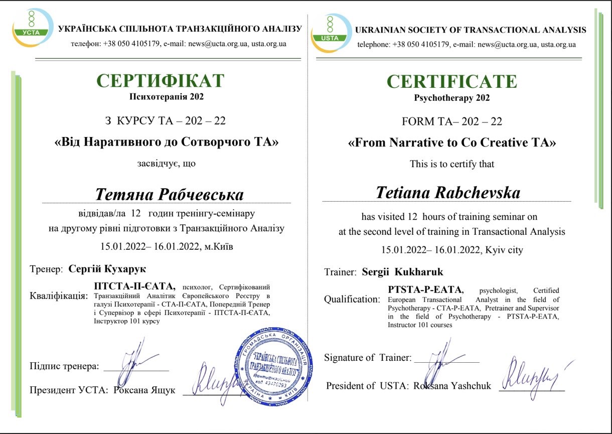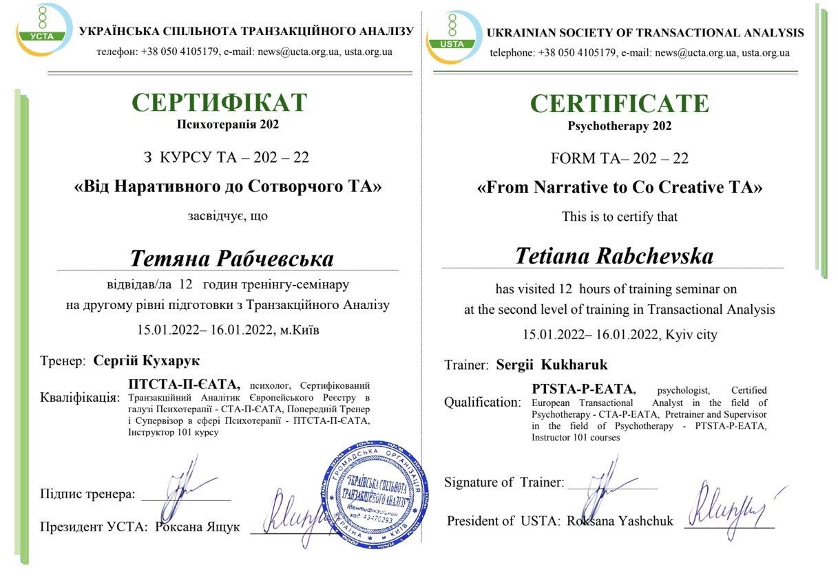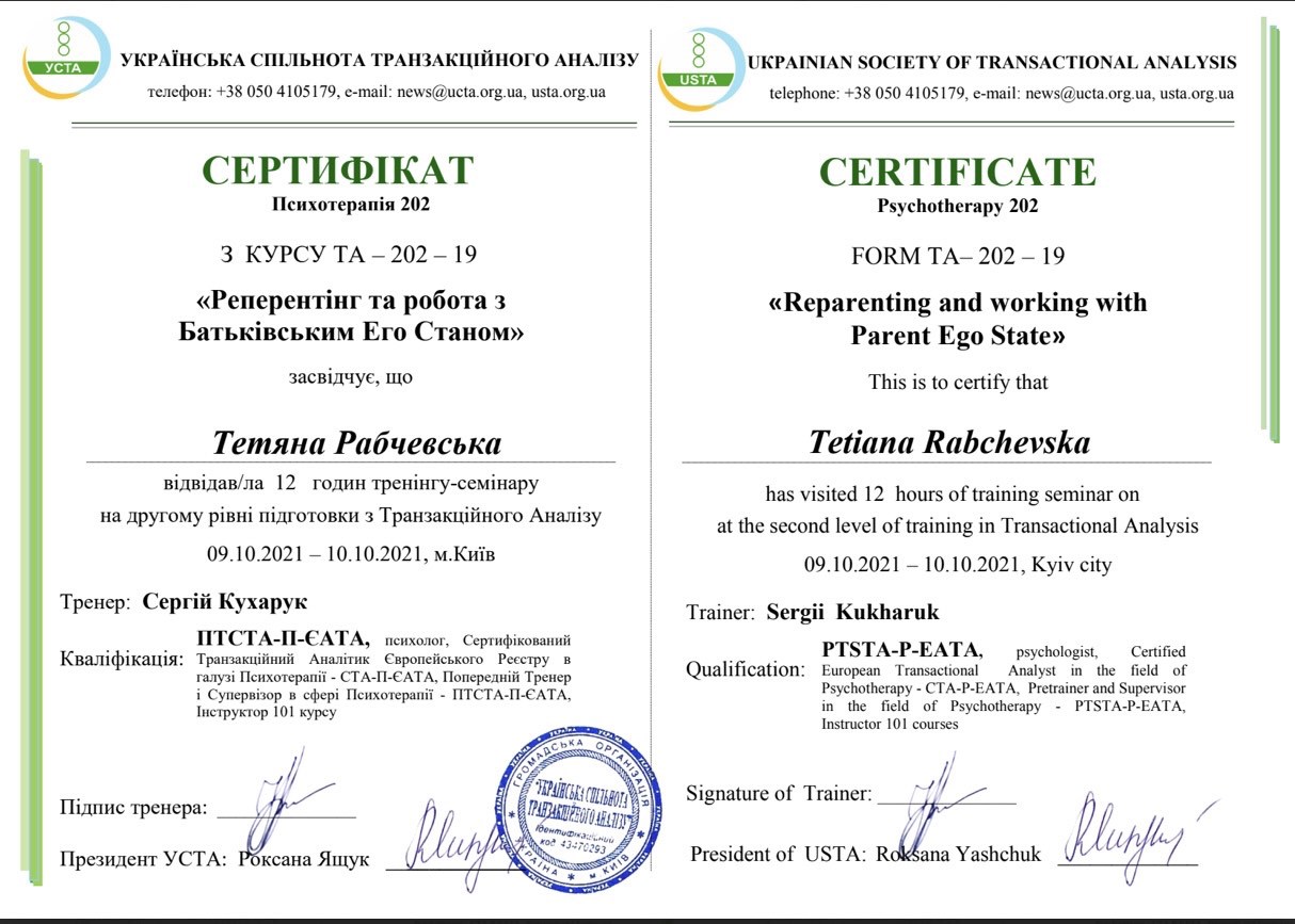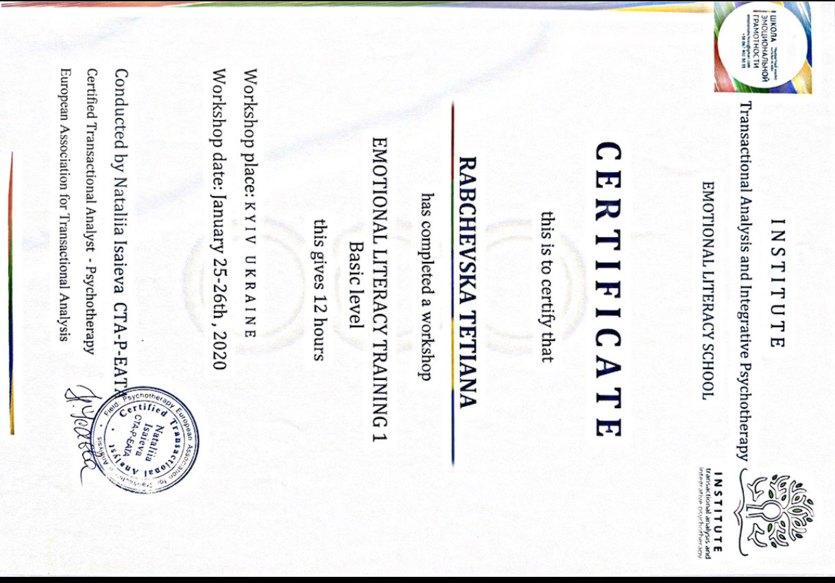 Проходила навчання в методі "Транзактний аналіз"
