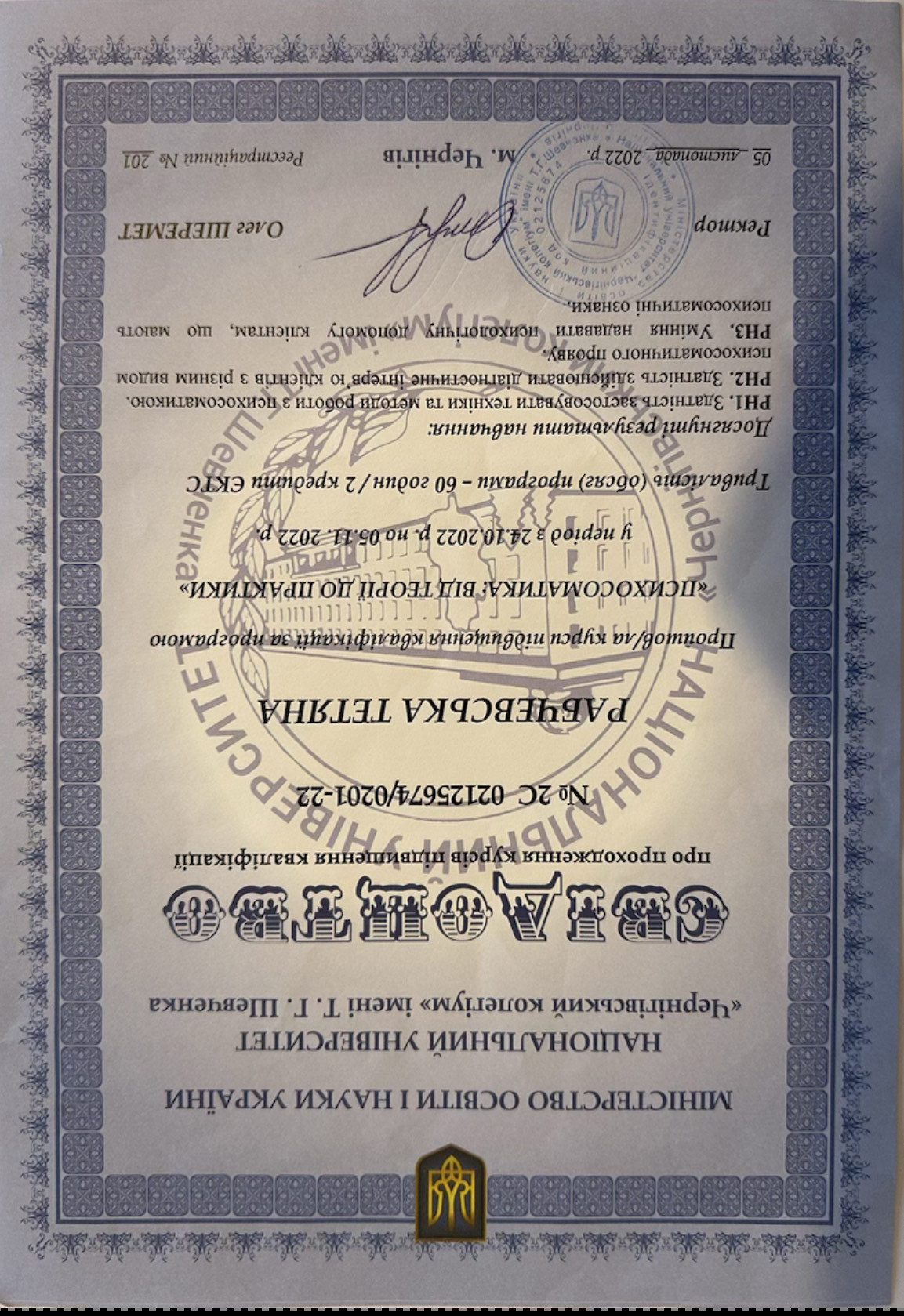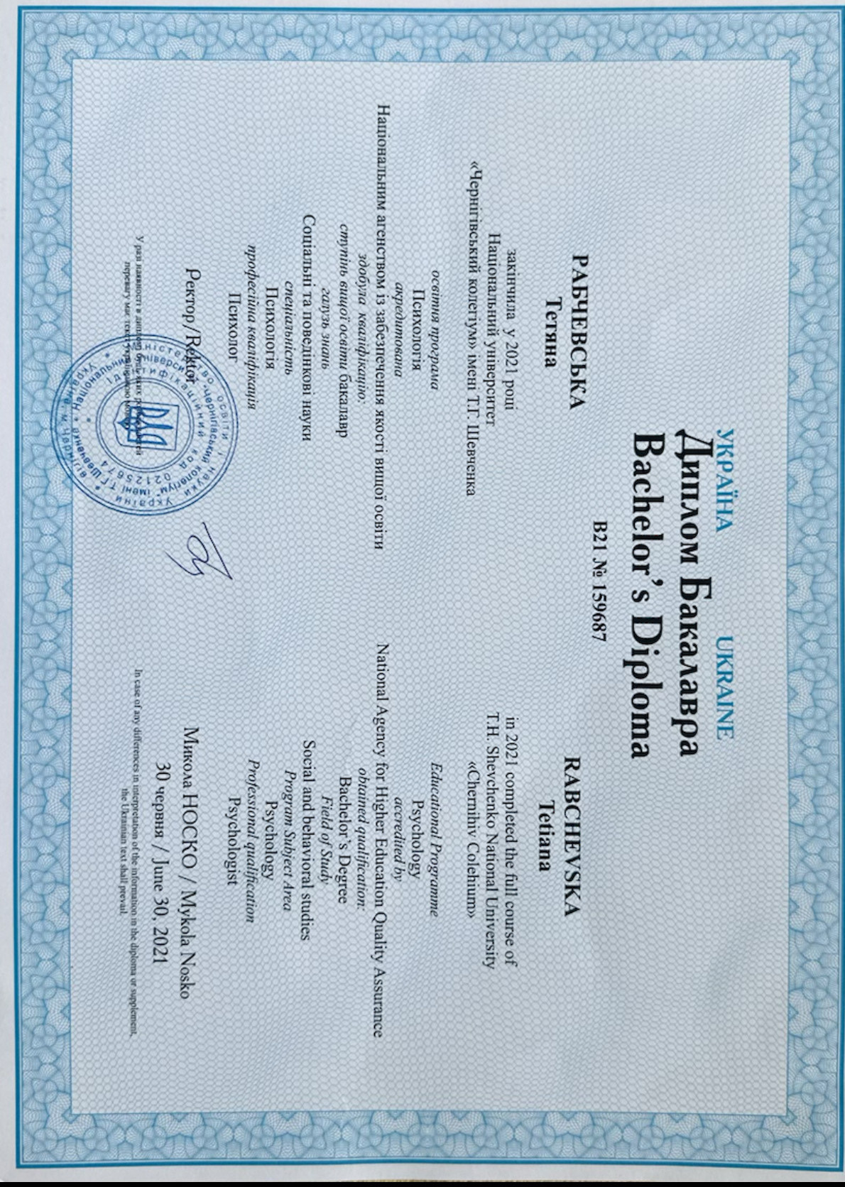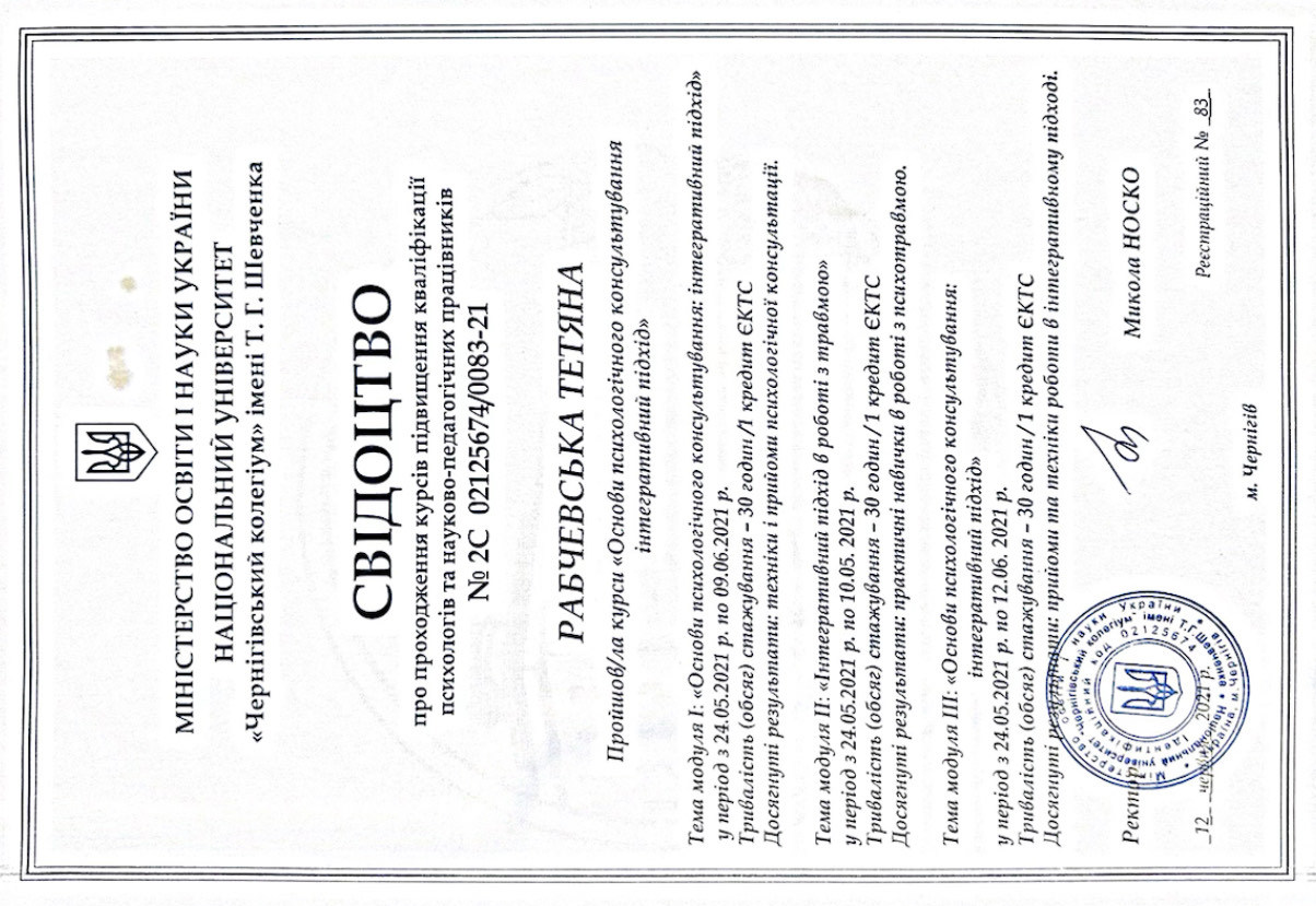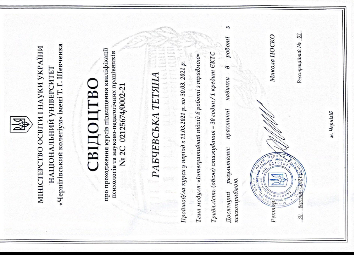 Національний університет "Чернігівський колегіум" імені Т.Г.Шевченка, професійна кваліфікація - психолог