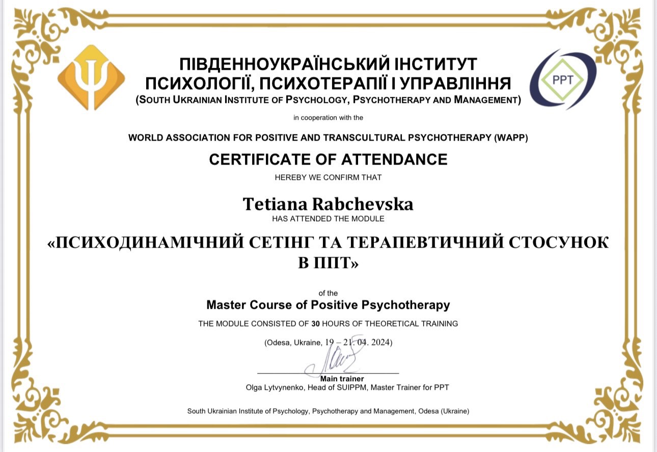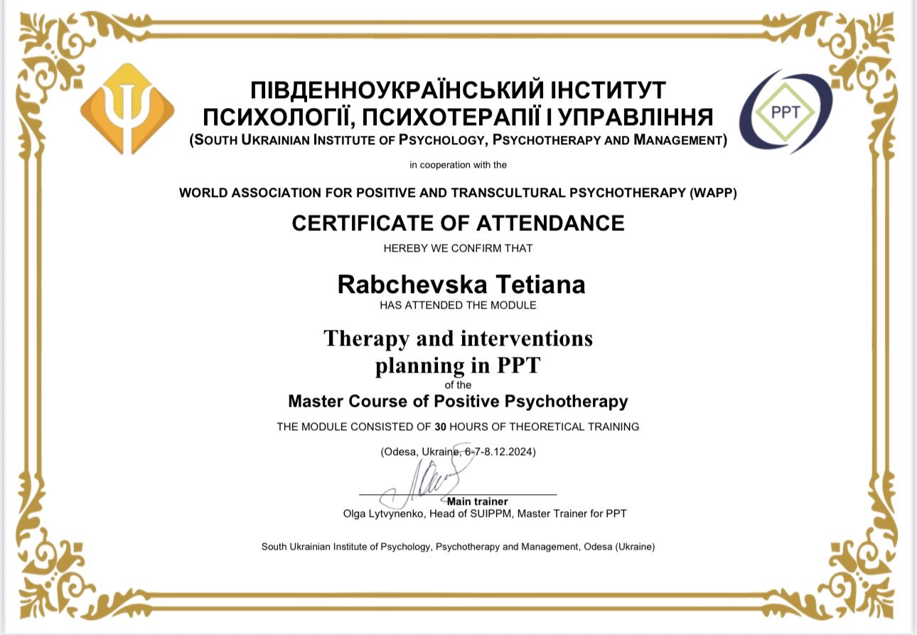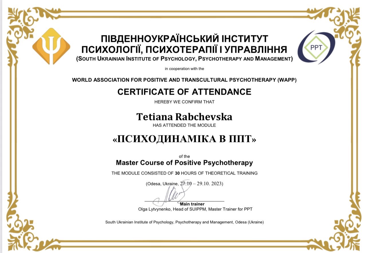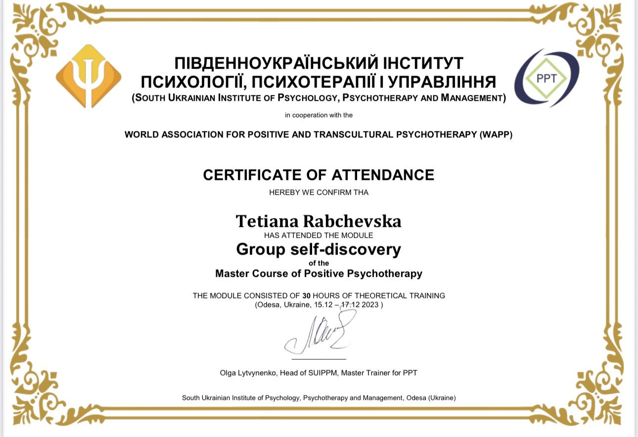 Навчаюся на Майстер курсі з позитивної психотерапії;