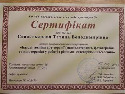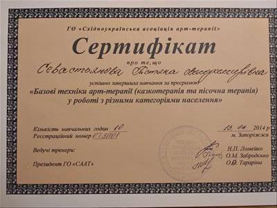 Східно-українська асоціація арт-терапії, сертифікат «Базові техніки арт-терапиії у роботі с різными категоріями населення».