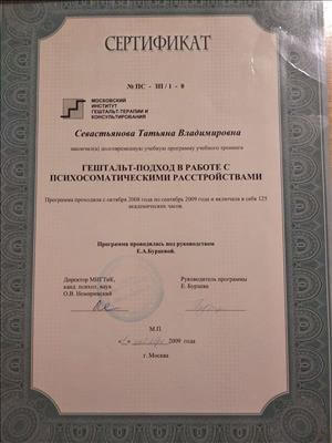 Жовтень 2008 – вересень 2009 р.р. - Московський інститут гештальт-терапії та консультування. Гештальт - підхід у роботі з психосоматичними розладами (125 акад. годин).