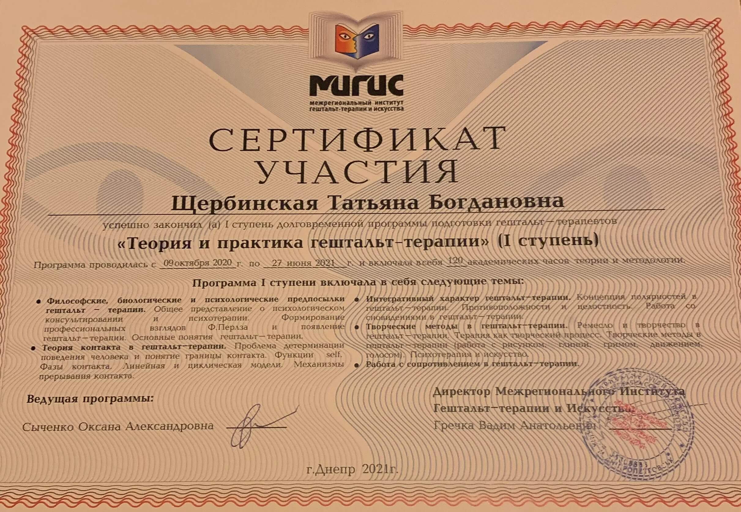 09 октября 2020 - 27 июня 2021, Кількість годин - 120