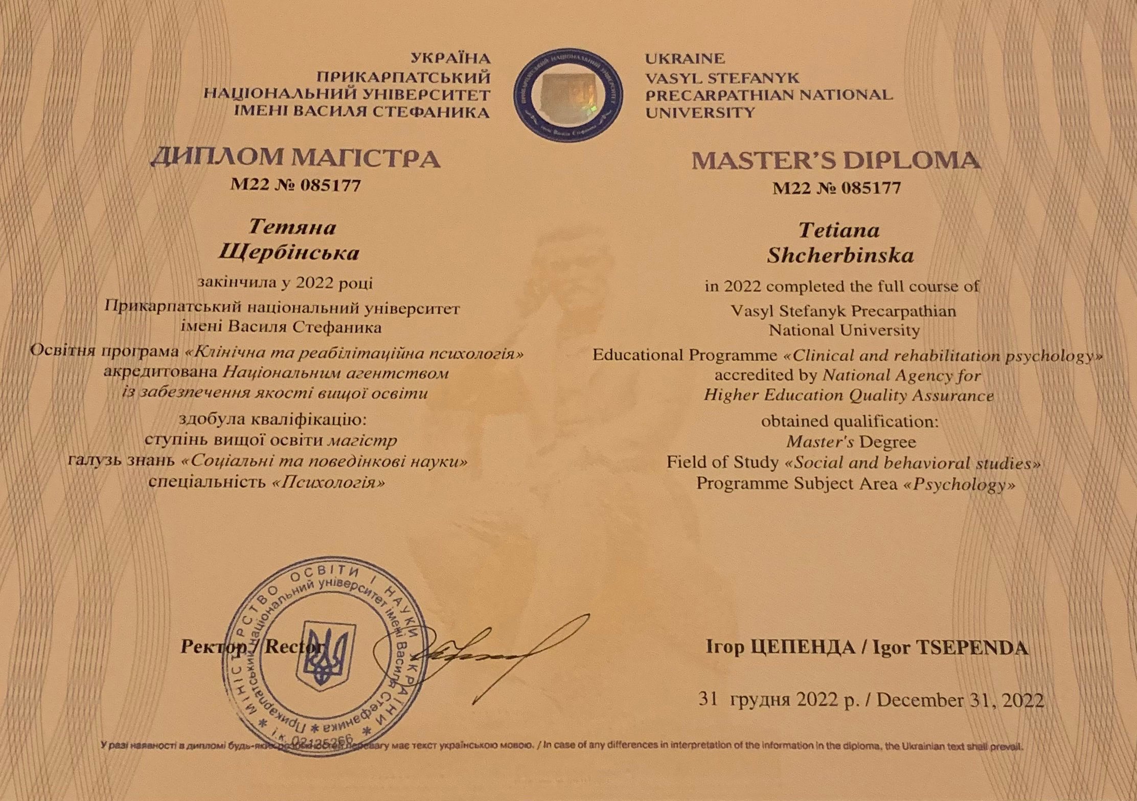 ПНУ їм. В. Стефаника, м. Івано-Франківськ, магістр психології. Навчання на гештальтерапевта МІГТІМ (м. Дніпро).