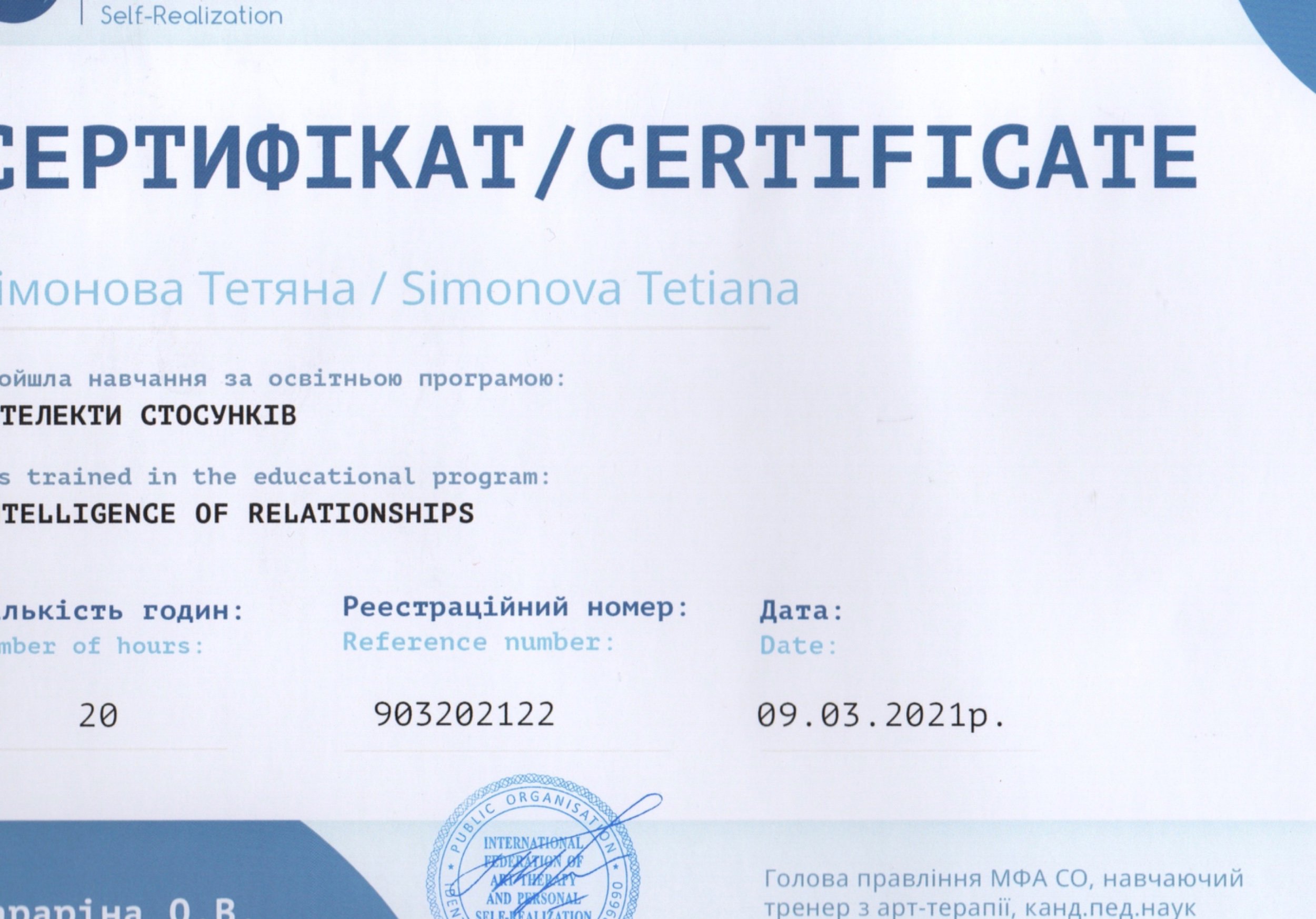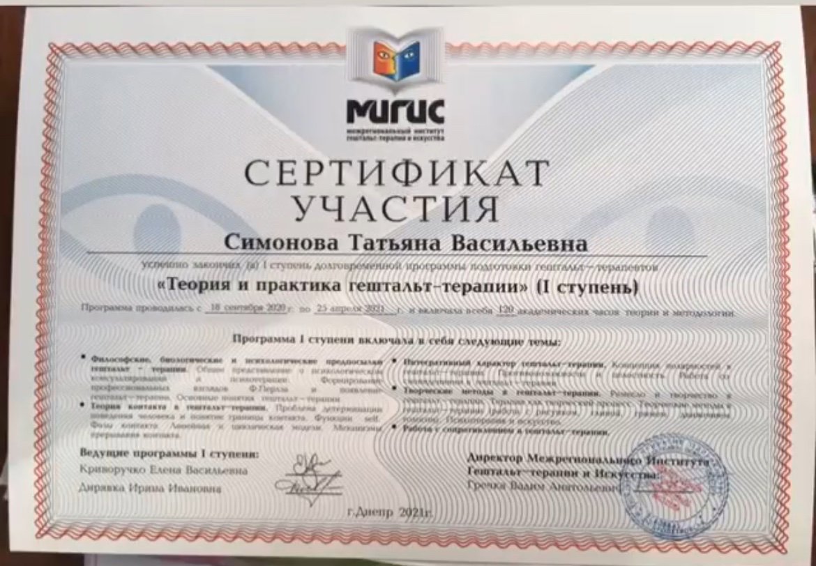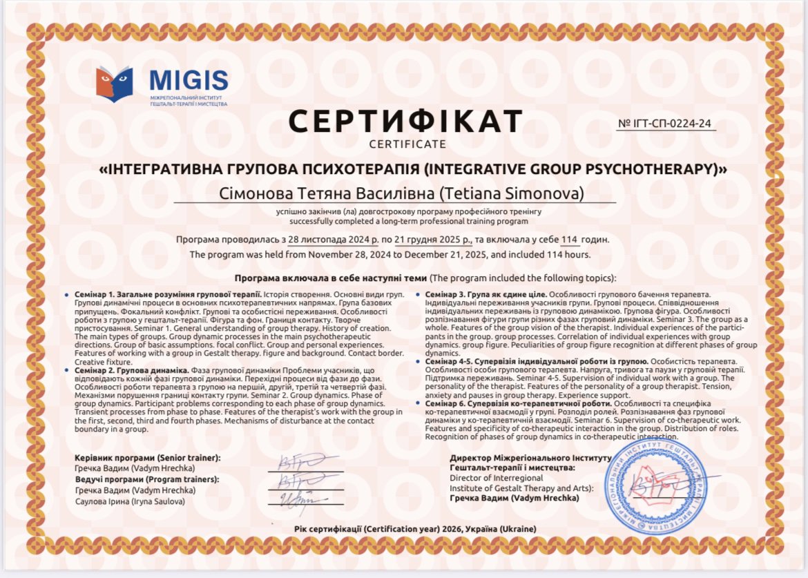 В 2002 році я закінчила психолого-педагогічний факультет - отримала диплом педагога-психолога( мріяла працювати психологом) і пішла в декрет на 3 роки з першою моєю дитиною, потім пішла з дитиною педагогом в дитячий садок, потім в школу вчителем початкових класів, психологія для мене була тоді як додаткова професія- я була поруч з дітьми, але забула про себе, свої відчуття. Згадала про себе, коли народила третю дитину майже в 40 років і впала в депресію. Тоді мені допомогла саме довга психотерапія і поруч з психотерапевтом я почала працювати над собою, знаходити нові свої опори, вибудовувати кордони і працювати більше психологом з клієнтами сама на себе, без посередників. З початком війни, я рік жила в Італії і там я працювала психологом в Eccoci Società Cooperativa, Ferrara , Італія з біженцями українськими дітьми та сім‘ями. Психотерапія дала мені багато можливостей для саморозвитку. Зараз я навчаюсь на 2 ступені і продовжую свій розвиток в гештальт-терапії