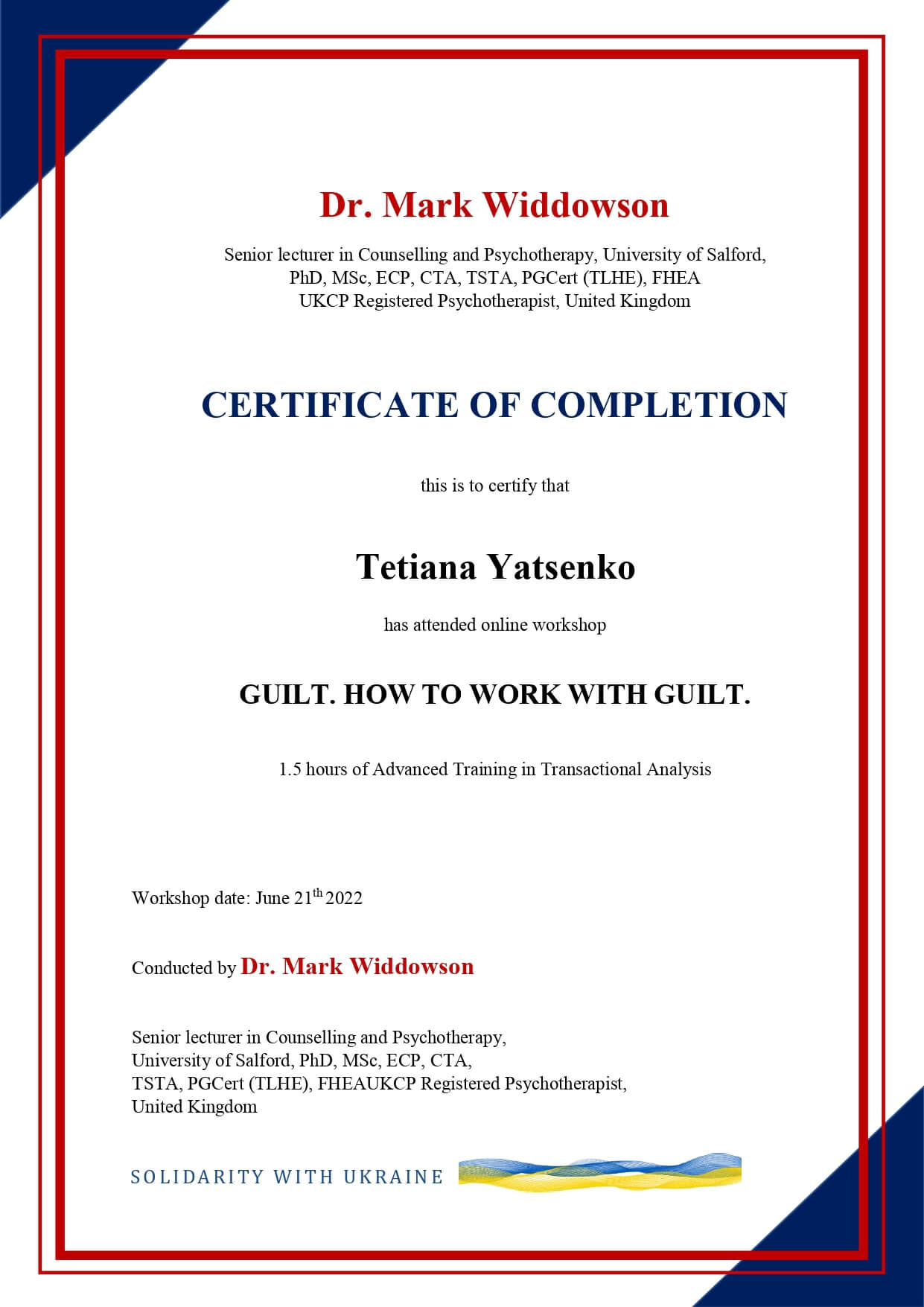 Відповідальна, емпатійна, коммунікабельна, творча, структурована, постійно удосконалюю свої навички, індивідуальний підхід до кожного клієнта, в роботі інтегрую різні підходи (транзакційний аналіз, EMDR, КПТ, тілесно-оріентовний), кризове консультування, фахівець з психологічної реабілітації після важких травм, оперативних втручань, тренер груп підтримки для жінок з травмою війни, втратами, невизначеною втратою; тренер психоедукаційних тренінгів, TRE тренер.