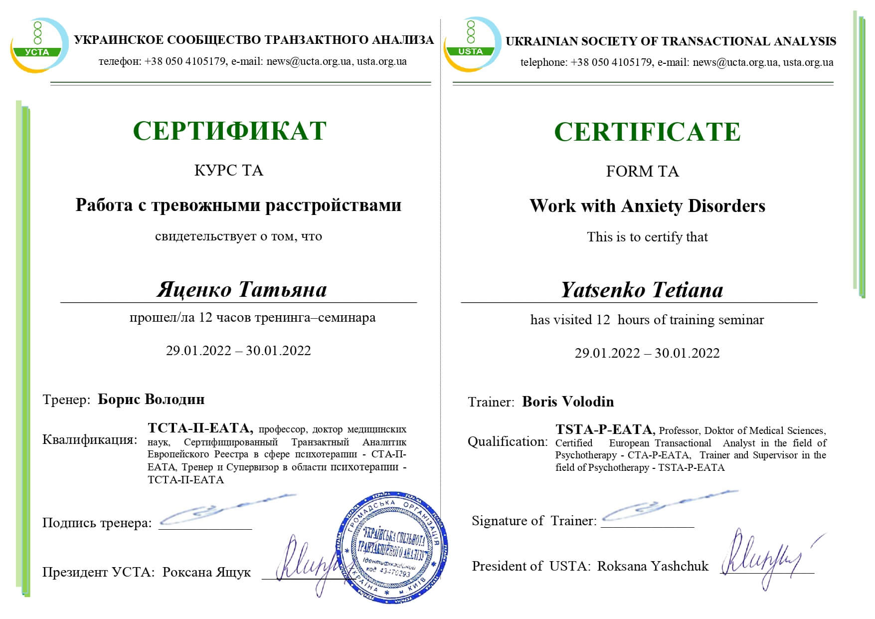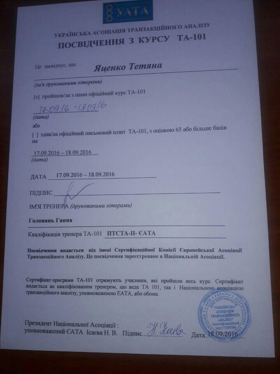 2016-2020 року навчання за напрямом «Психотерапія» при Європейскiй та Української Асоціації транзактного аналізу