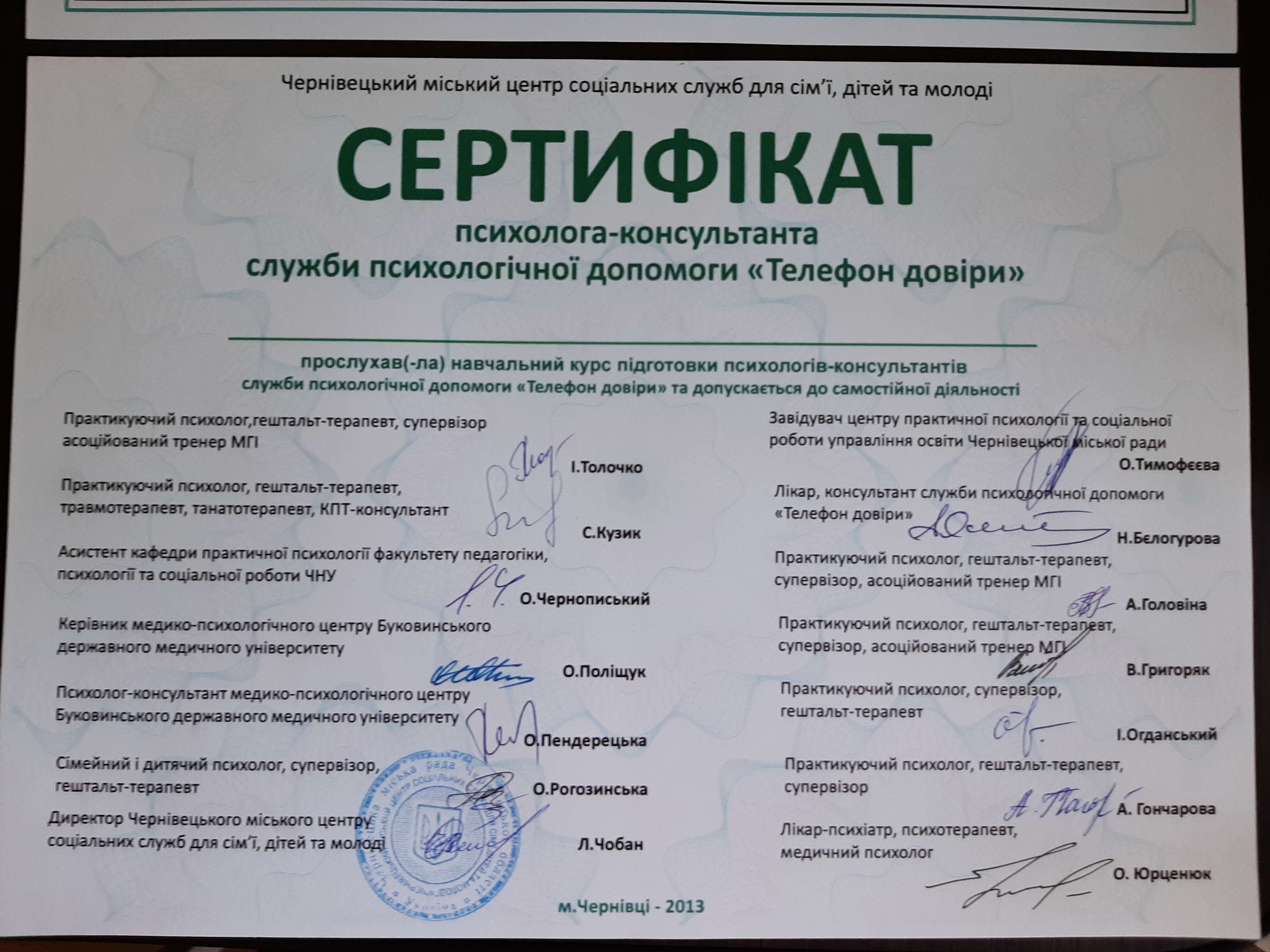 2012-2017 рр. Навчання у Буковинському проекті групової психотерапії. Напрямок гештальт-терапія.