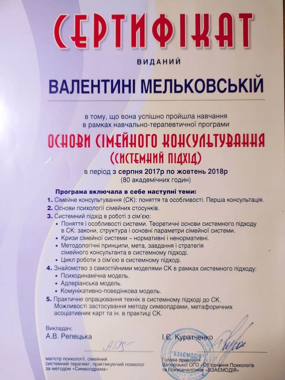 2017-2018р. – Запорізьке «Об'єднання Психологів та Психоаналітиків «Взаємодія», «Основи сімейного консультування». Програма під керівництвом Репецької О.В.