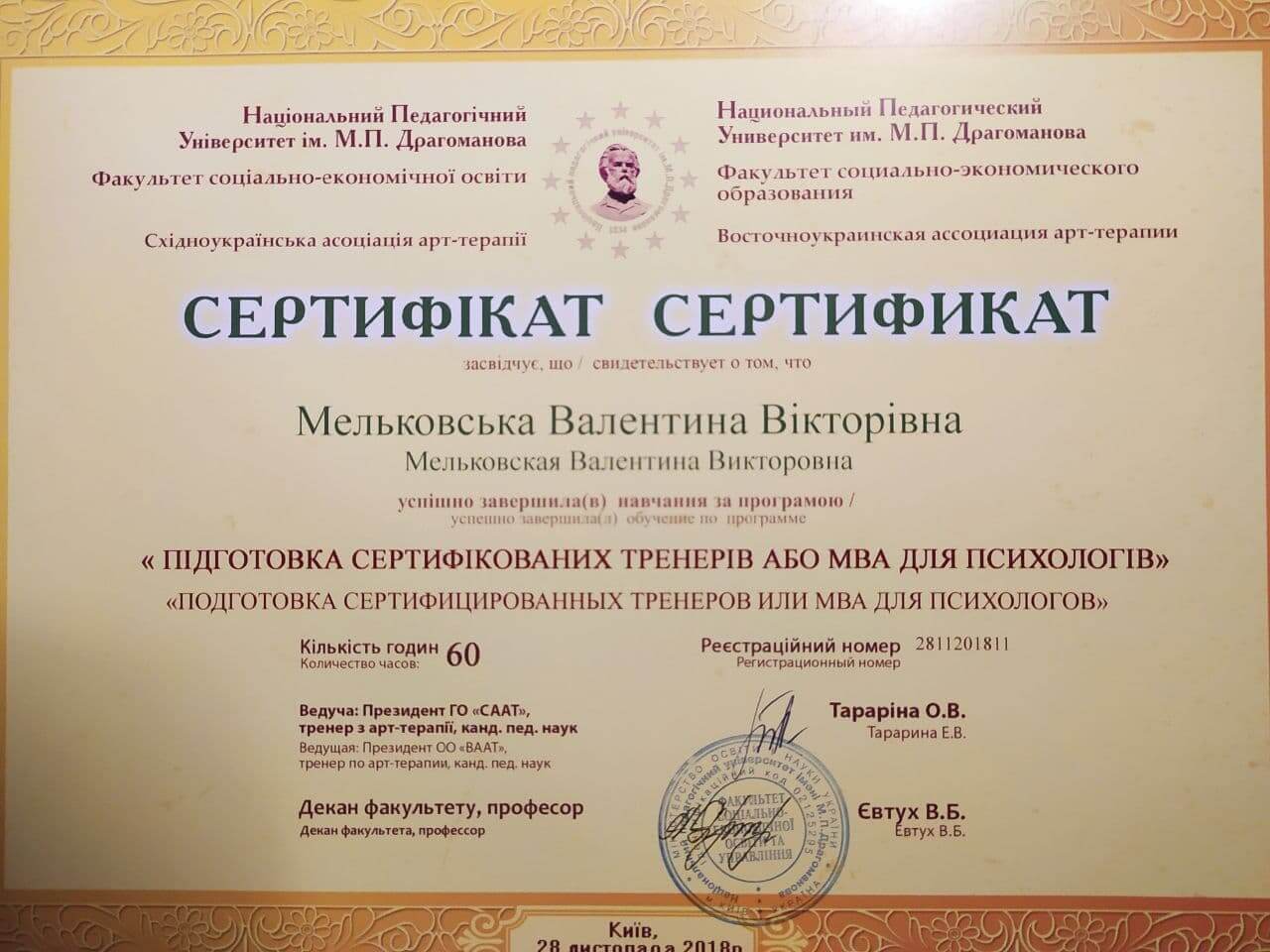 2018р. - Національний Педагогічний Університет ім. М.П. Драгоманова, "Підготовка сертифікованих тренерів або МВА для психологів". Програма під керівництвом Тараріна Є.В. Сертифікат №2811201811.