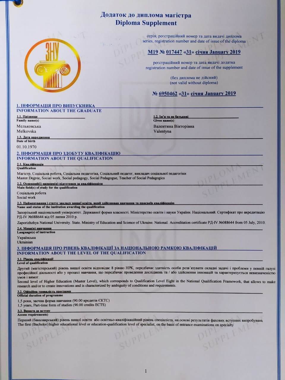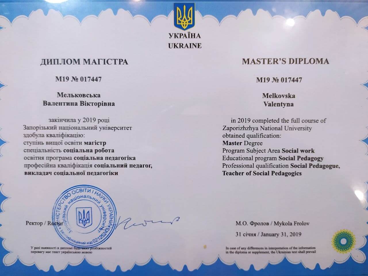 2018р. – Запорізький національний університет, м. Запоріжжя, Факультет соціальної педагогіки та психології, спеціальність „Соціальний педагог”.