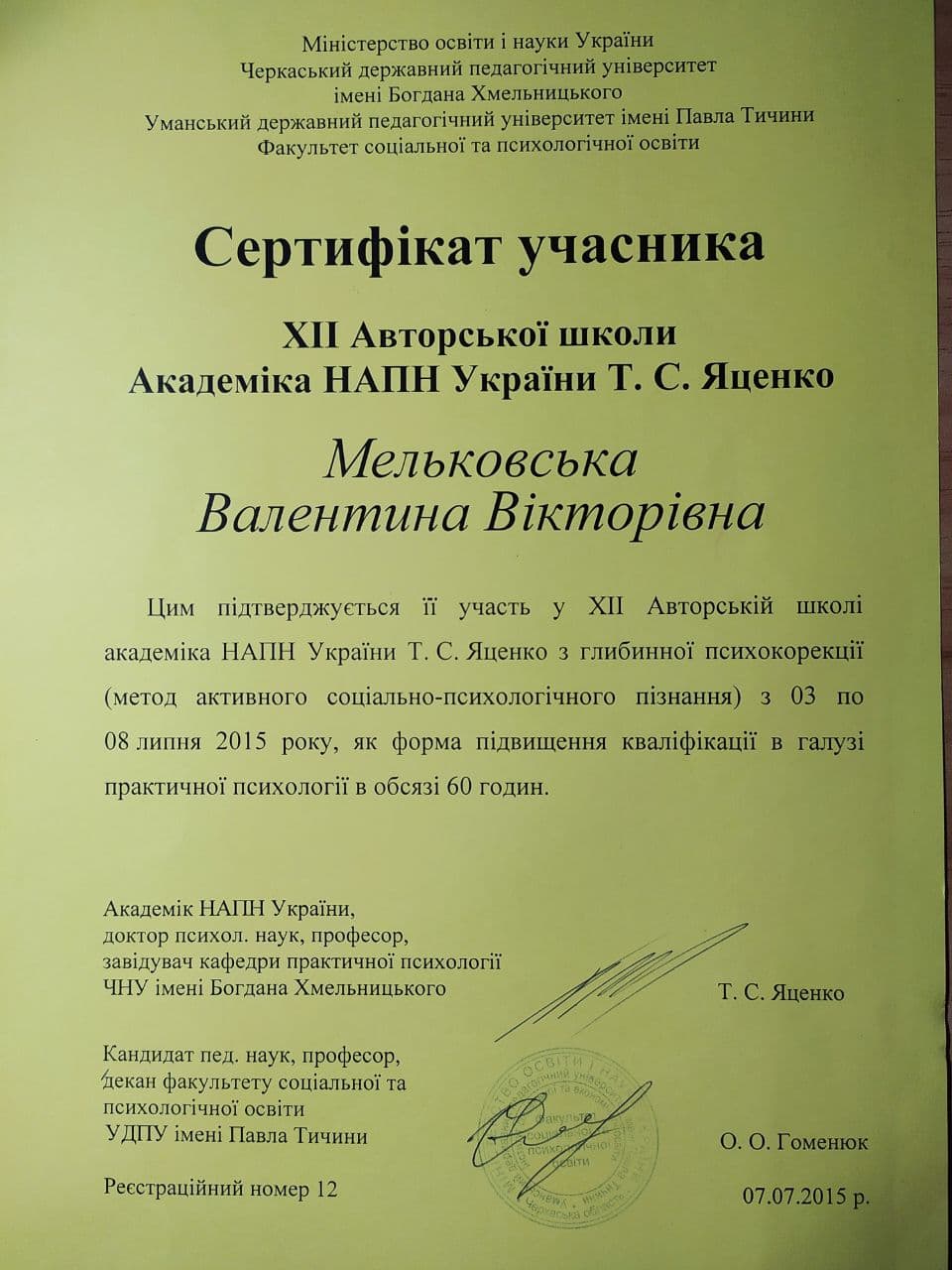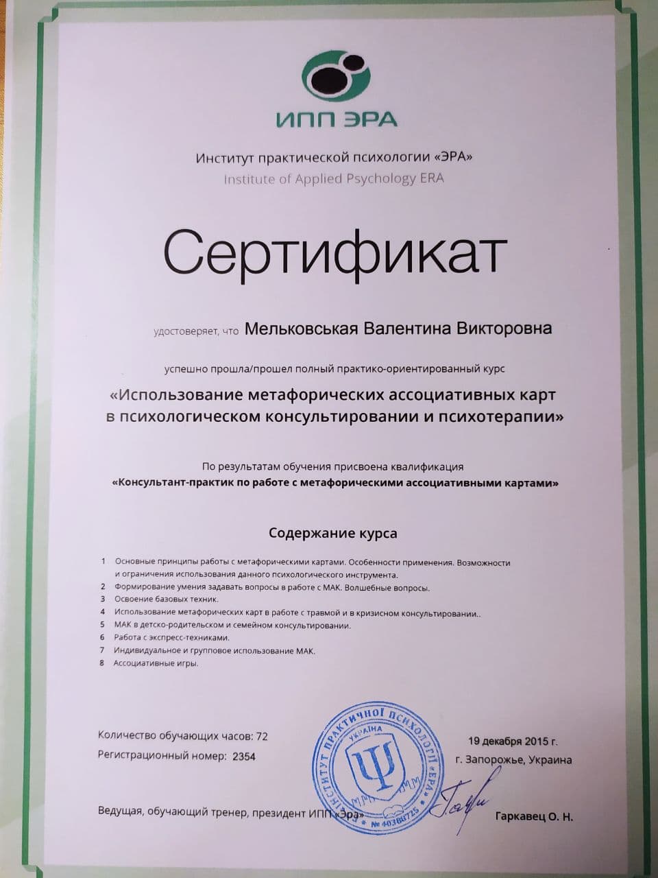 2015р. – Інститут практичної психології «ЕРА», «Використання метафоричних карток у психологічному консультуванні та психотерапії». Програма під керівництвом Гаркавець О.М. Сертифікат №2354.