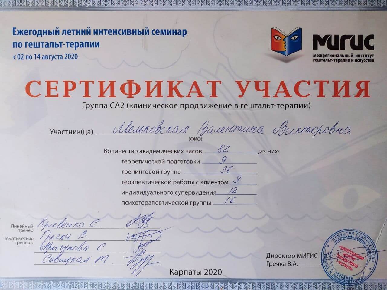 У 2012 році пошуки виходу із тупикової ситуації привели мене до особистої терапії. Потім я вирішила захоплення психологією перетворити на справу свого життя і здобула другу вищу освіту. Паралельно вступила до Міжрегіонального інституту гештальт-терапії та мистецтва. За ці роки я пройшла понад 250 годин особистої терапії, понад 1200 годин групової психотерапії, понад 100 годин супервізії.