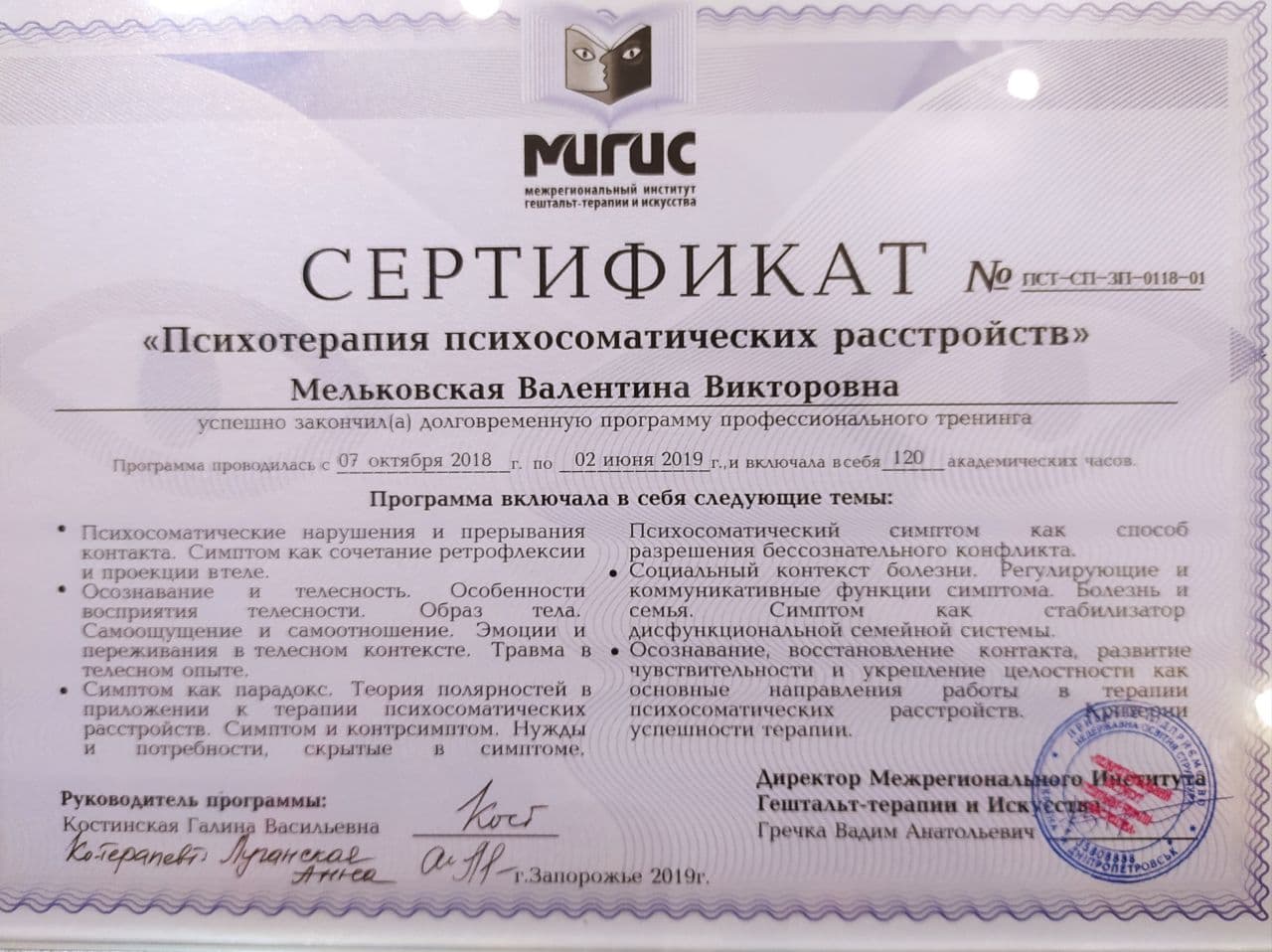 2018-2019р. – (МІГІС), «Психотерапія психосоматичних розладів». Програма під керівництвом Костинської Г.В.