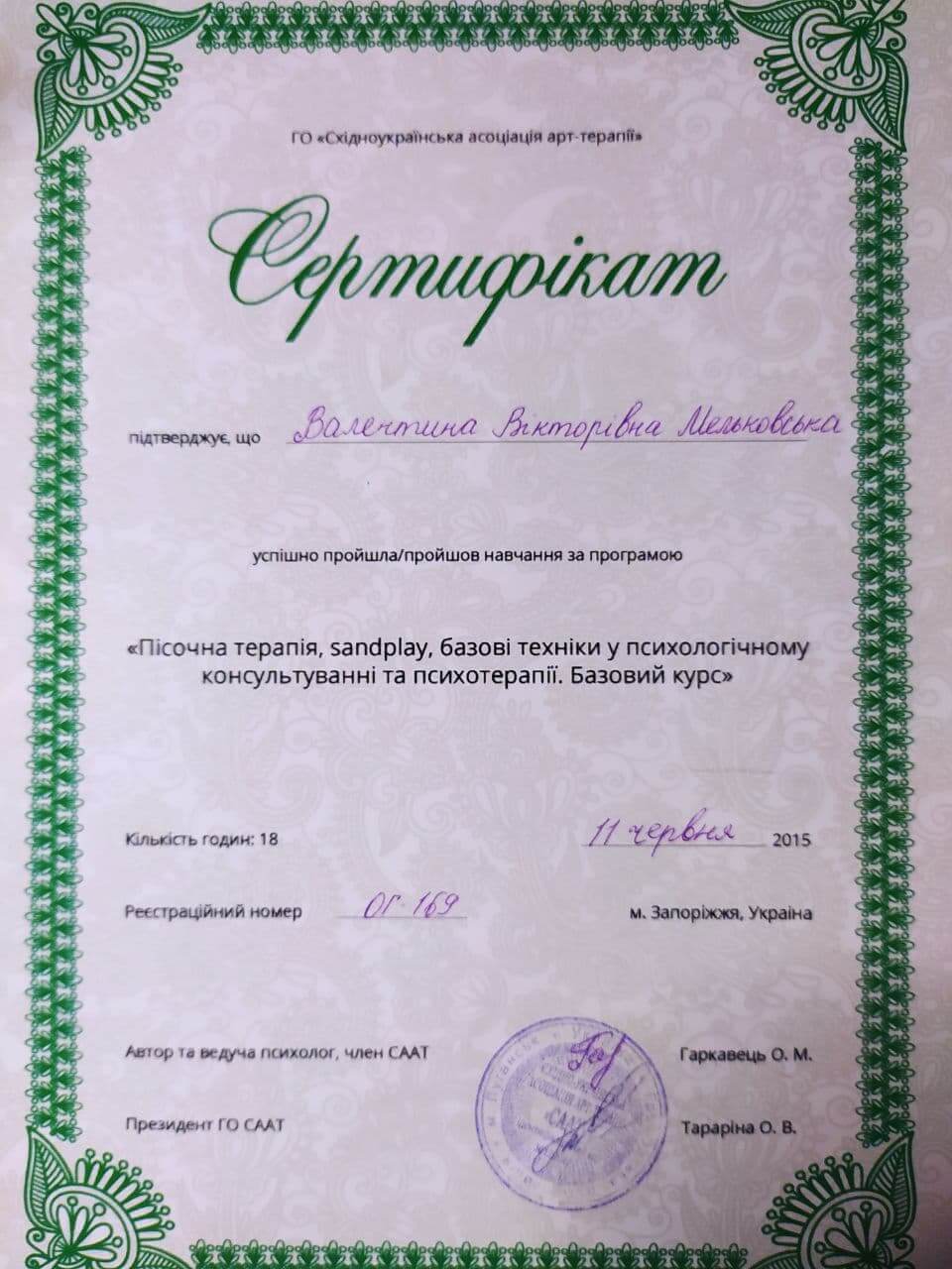 2015р. – Інститут практичної психології «ЕРА», «Базові техніки пісочної терапії у психологічному консультуванні та психотерапії». Програма під керівництвом Гаркавець О.М. Сертифікат №ОГ-169.