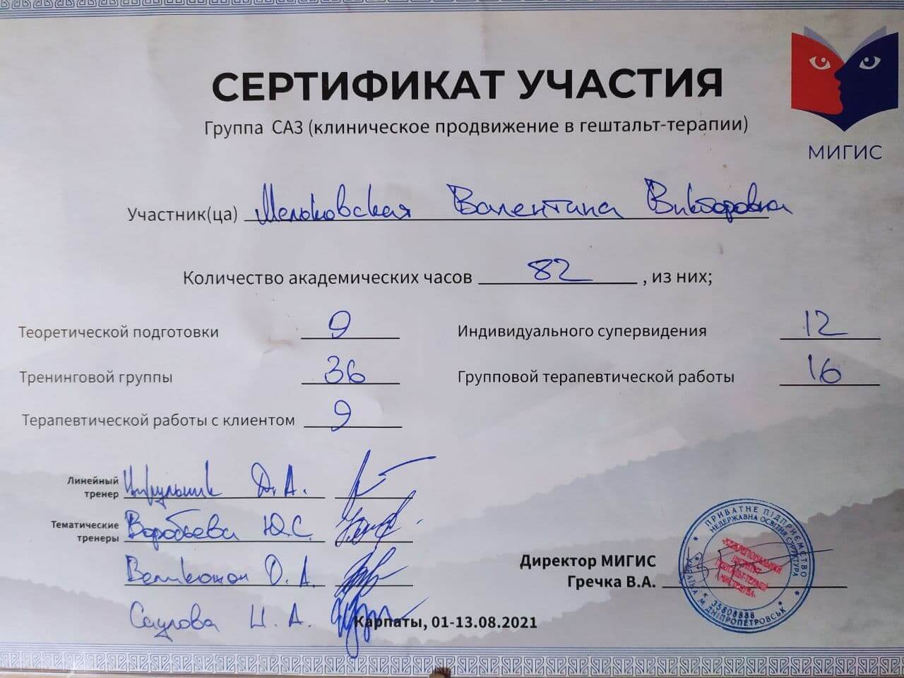 2021-2022р. – (МІГІС), «Терапевтичні відносини. Поглиблений курс». Програма під керівництвом Стригунової С. А.
