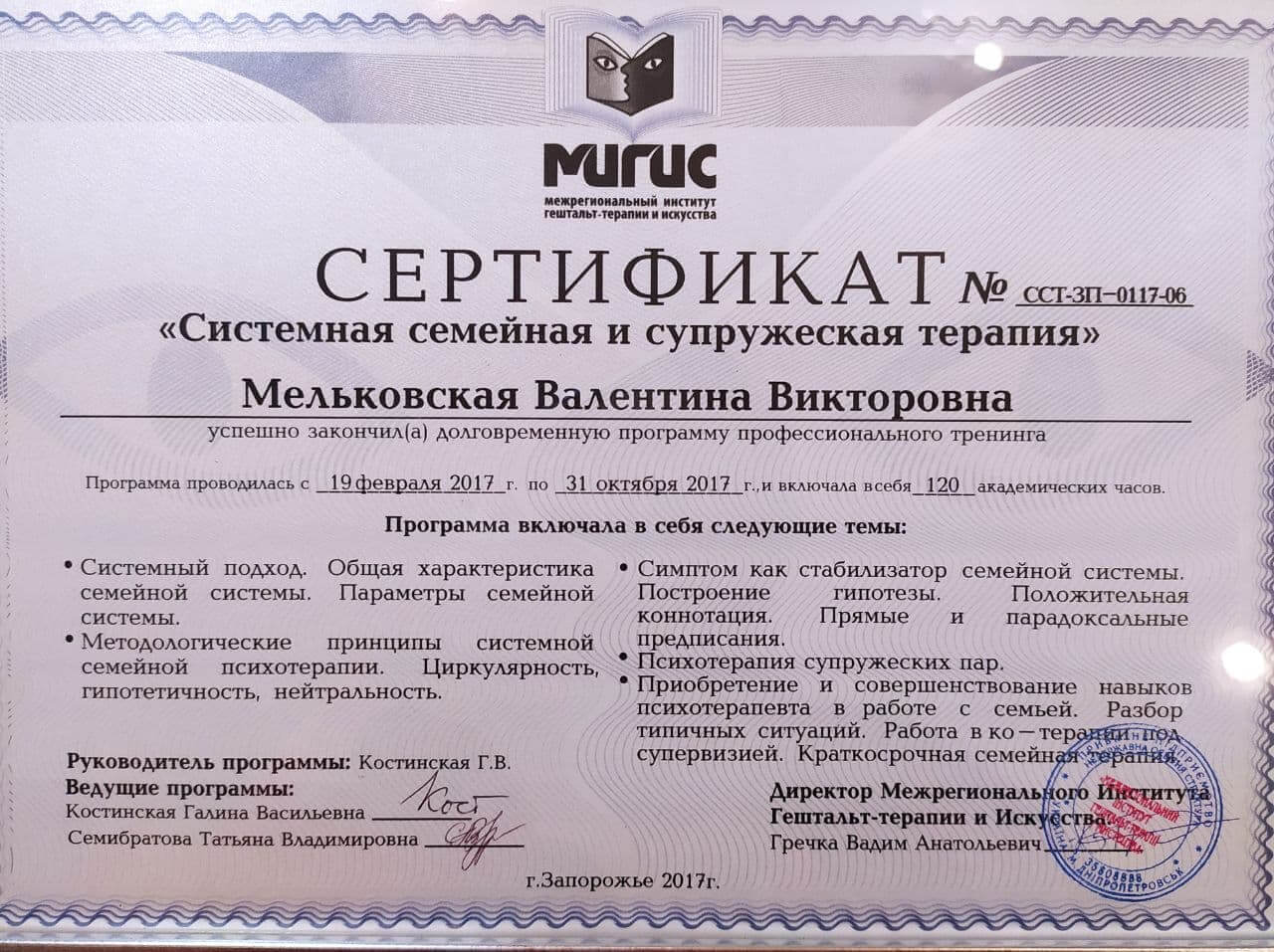 2016-2017р. – Міжрегіональний Інститут Гештальт-терапії та Мистецтва (МІГІС), «Системна сімейна та подружня терапія». Програма під керівництвом Костинської Г.В.