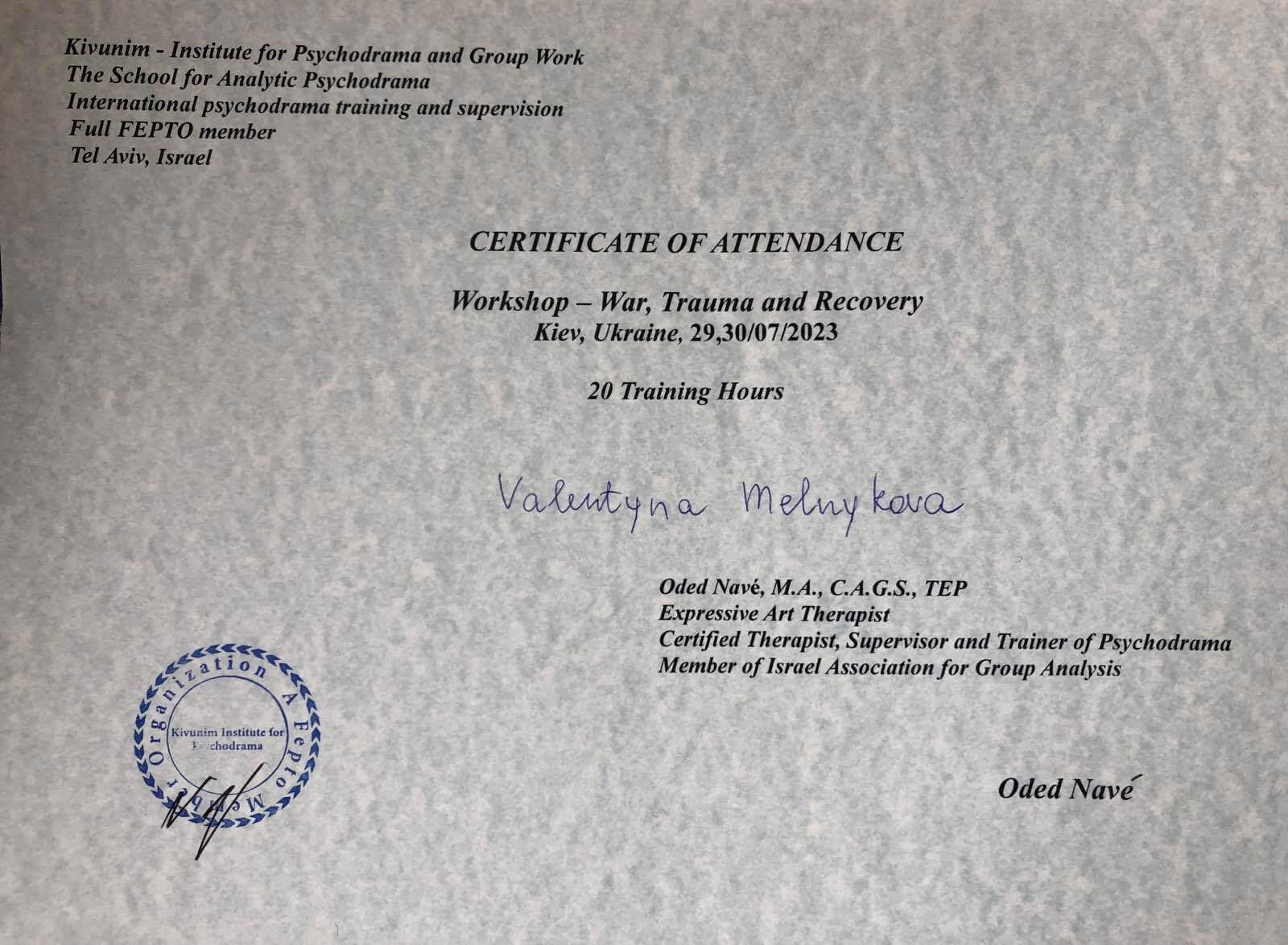 2. "Подолання емоційних наслідків війни" ГО Міжнародний Інститут психодрами та практичної психології, Київ / Oded Nave (Ізраїль), 2024 / 20год, сертифікована