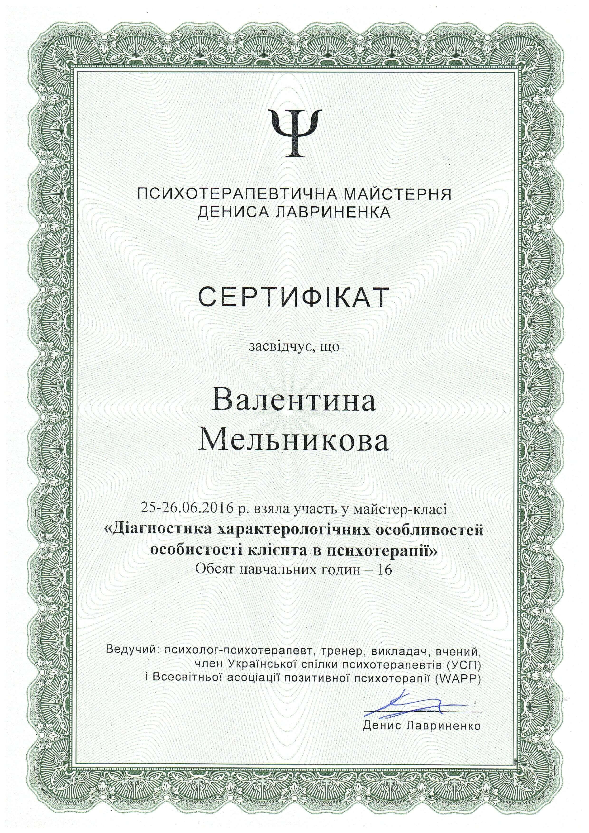 12. "Діагностика характерологічних особливостей особистості клієнта у психотерапії. Д. Лавріненко" сертифікована, 2017