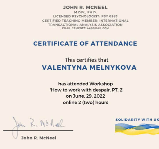 - Гештальт-підхід НАГТУ, 1-2 сходинка, 420 год, сертифікована безумовно, психотерапевт