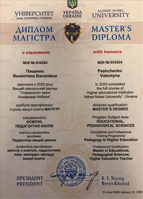 Alfred Nobel University (магістр освітніх, педагогівниз наук, психолог, викладач ЗВО)