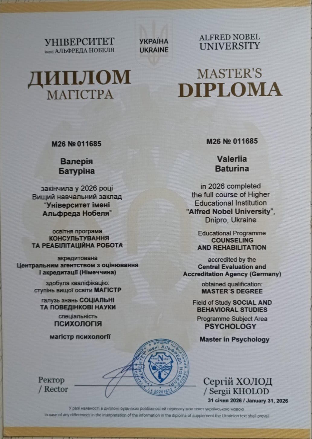 Я творча особистість, люблю іноземні мови, читати, слухати музику, зустрічатися з друзями. Малюю абстрактні пейзажі — через колір і простір проживаю те, що не завжди можна висловити словами.