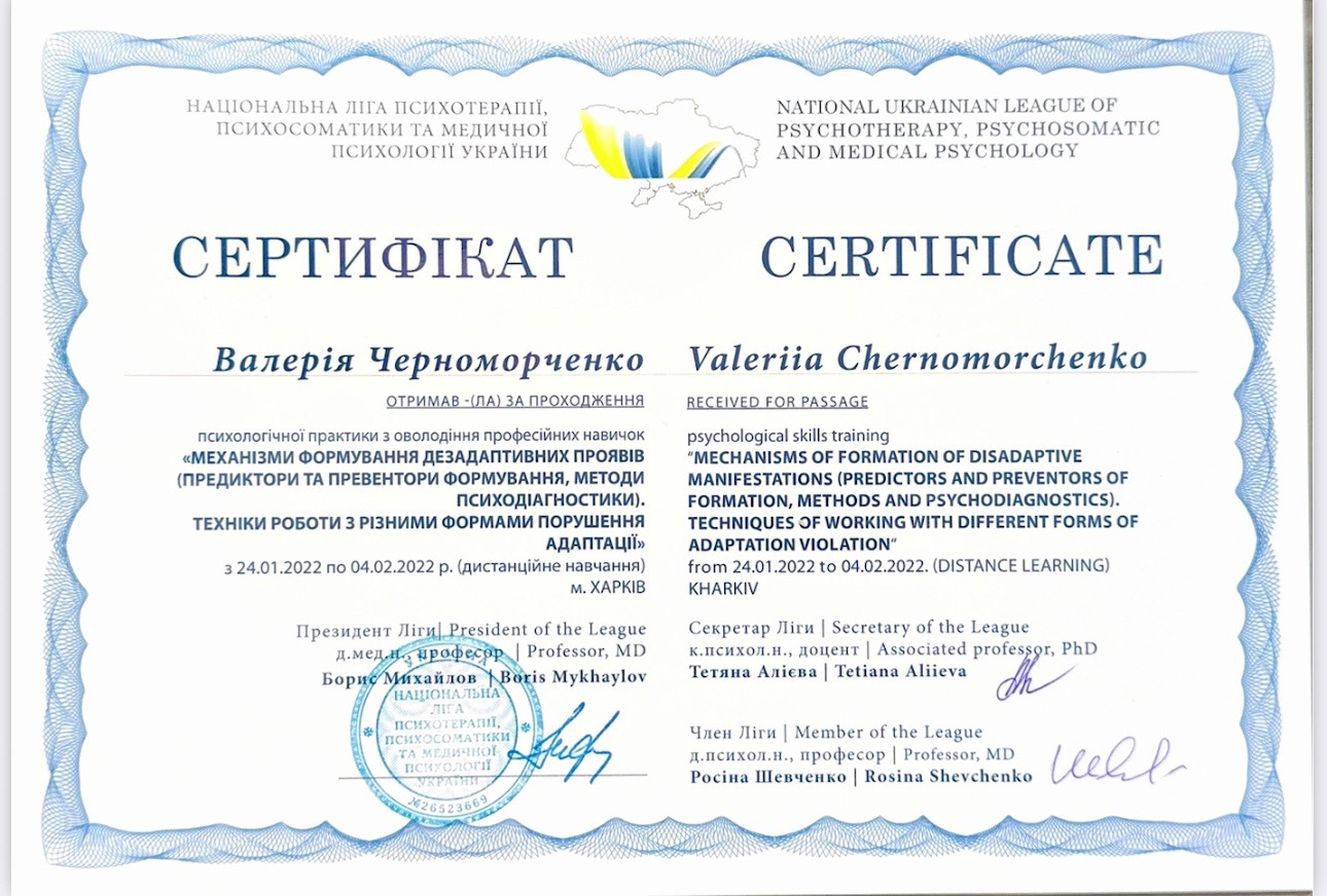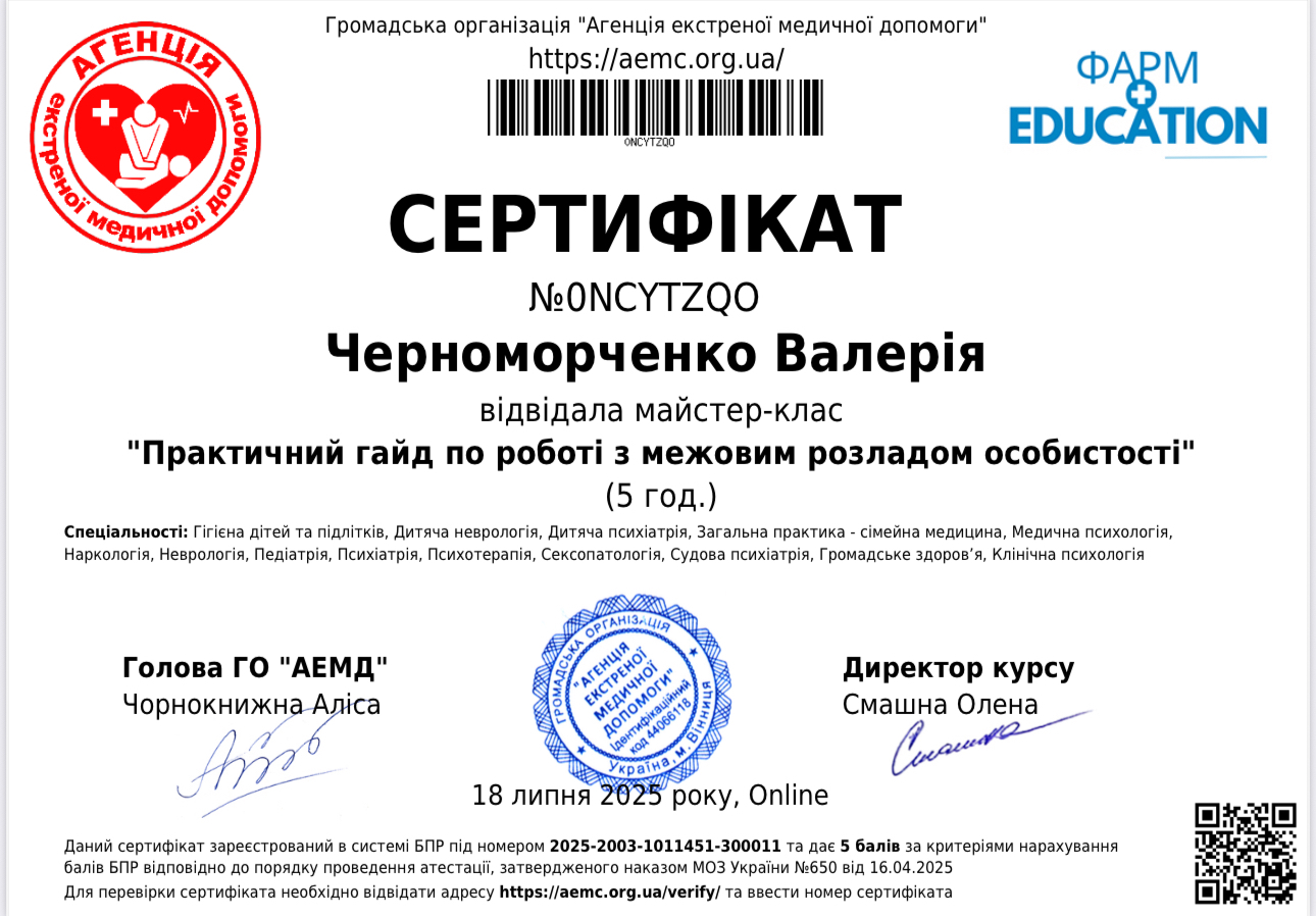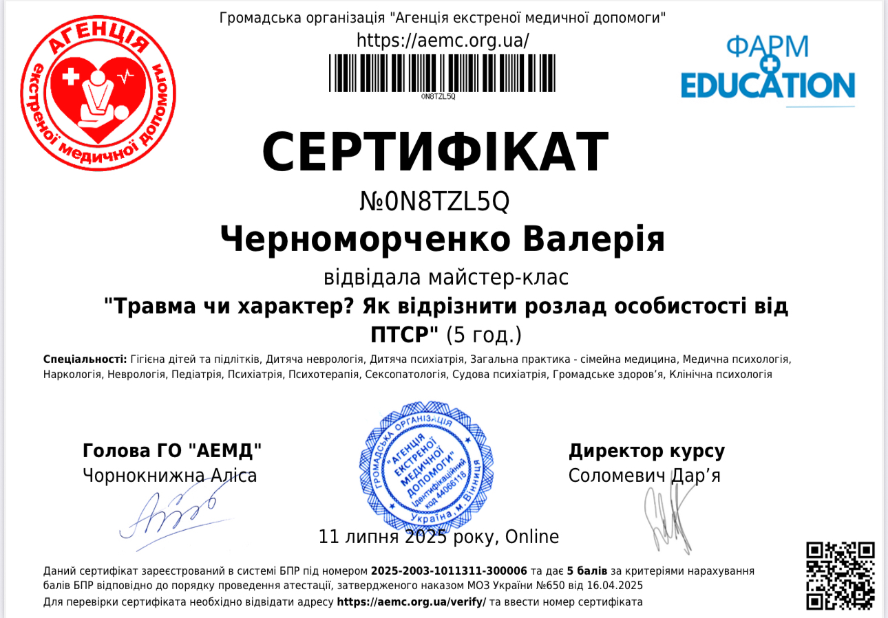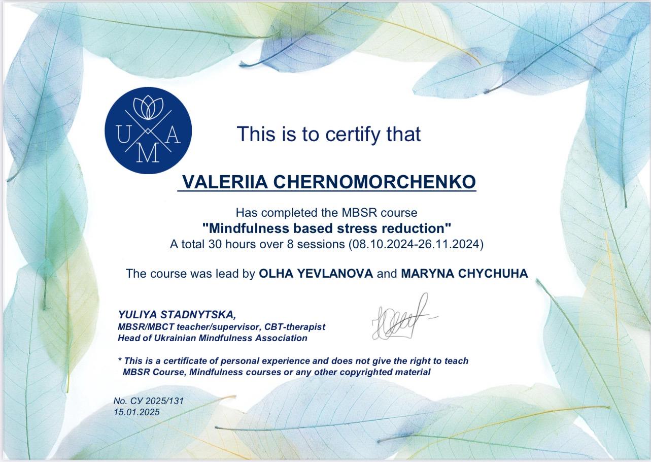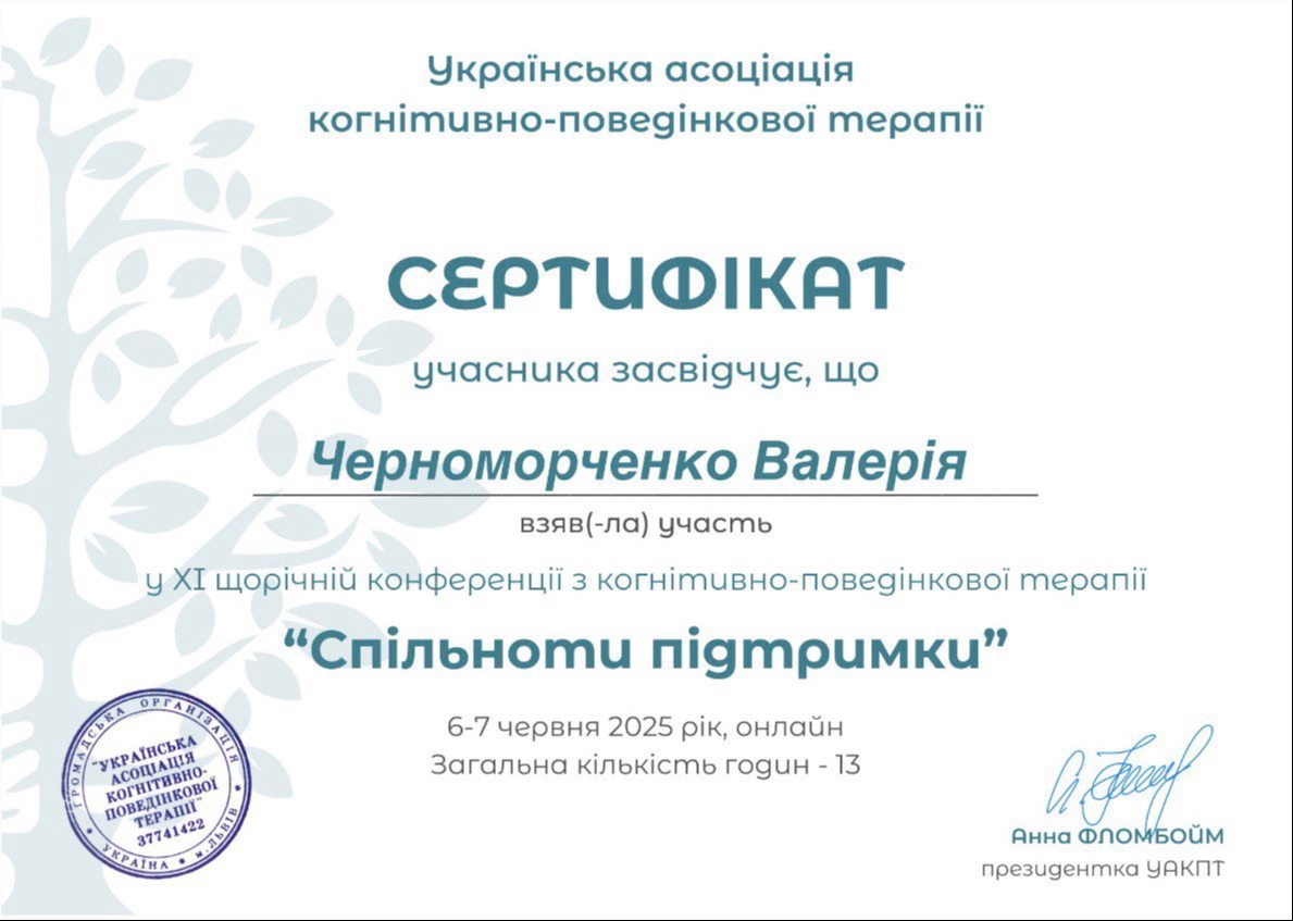Пройшла курс, що поглибив знання та практичні навички у схема-терапії, супроводі переживання втрати та горювання (включно з військовими травмами), роботі з підлітками з розладами харчової поведінки, а також у підтримці клієнтів з розладами особистості, зокрема межовим розладом. Курс поєднував теорію, практичні вправи та кейс-аналіз для ефективної роботи у різних життєвих контекстах.