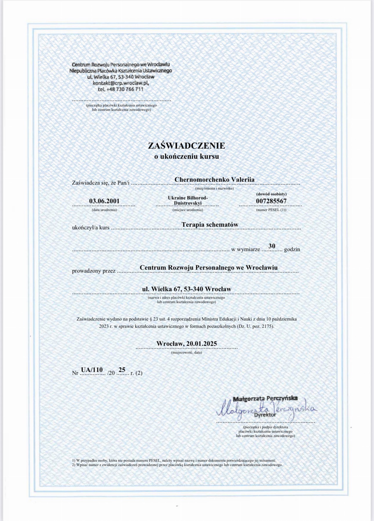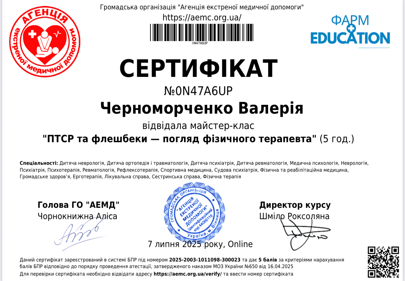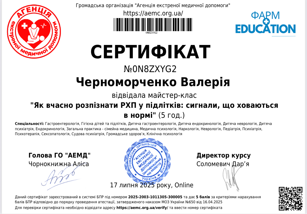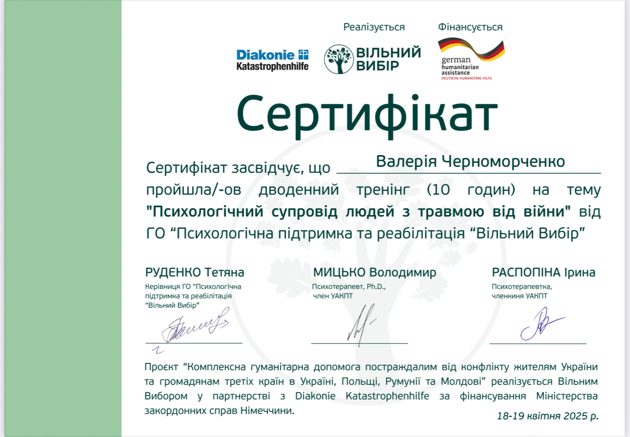 Пройшла курс, що поглибив знання та практичні навички у схема-терапії, супроводі переживання втрати та горювання (включно з військовими травмами), роботі з підлітками з розладами харчової поведінки, а також у підтримці клієнтів з розладами особистості, зокрема межовим розладом. Курс поєднував теорію, практичні вправи та кейс-аналіз для ефективної роботи у різних життєвих контекстах.