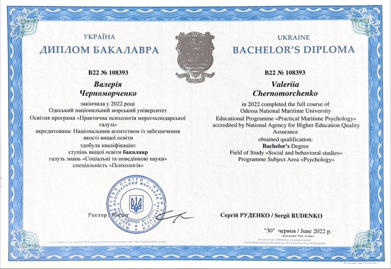 Закінчила ОНМУ, маю ступінь магістра зі спеціальності «психологія». Є членкинею УАКПТ, маю освіту в методі КПТ, MBSR та Схема терапії. Систематично проходжу курси з підвищення кваліфікації та актуальні наразі теми, до прикладу «Психологічна допомога при військовій травмі» та інше. Зараз навчаюсь в УІКПТ на психіатрії та в процесі навчання на психотерапевта.