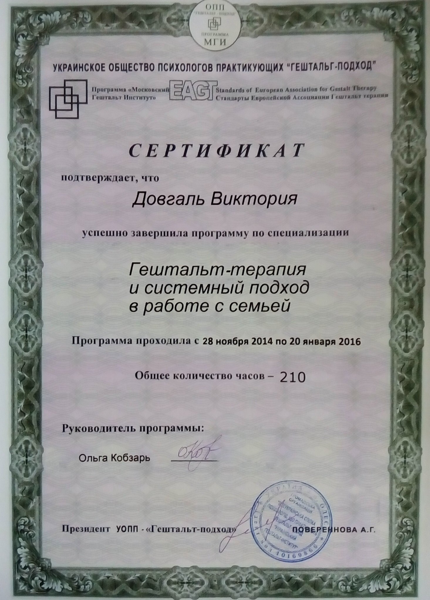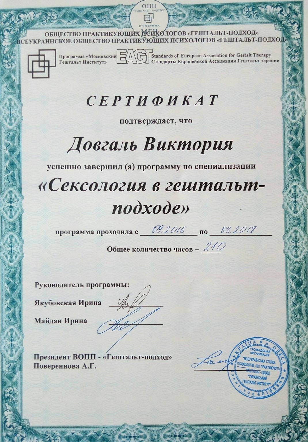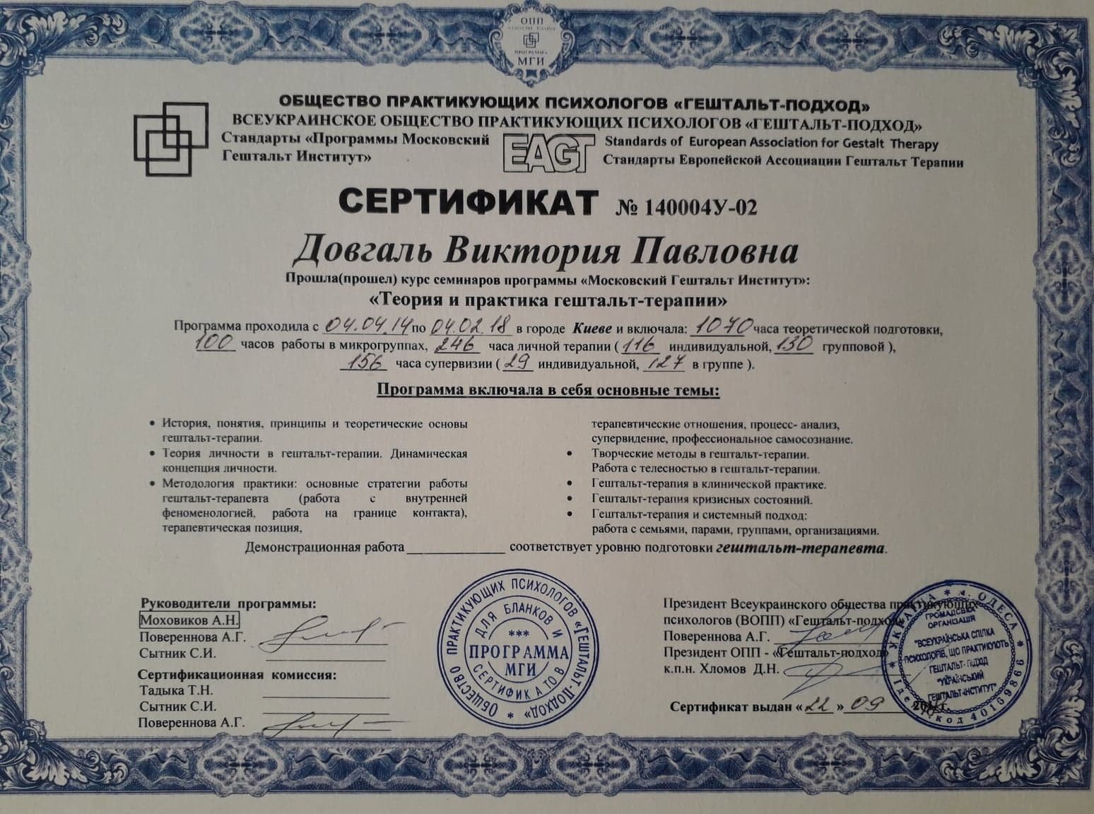 Мене звати Вікторія Довгаль, я практикуюча психологиня, гештальт-терапевтка та сексологиня. Моя приватна практика розпочалася з 2014р і весь цей час я підтримую людей у найважливіших та найтонших темах їхнього життя: стосунки, кохання, інтимність, самооцінка, кризи та пошук себе.