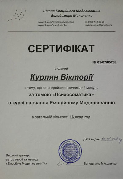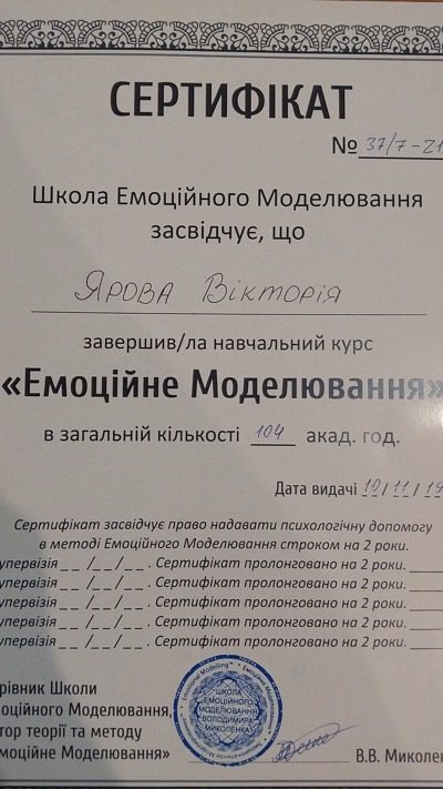 Працюю в інтегративному методі, методі арт терапія, метод емоційне моделювання, консультування.