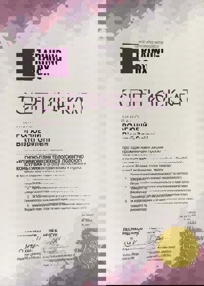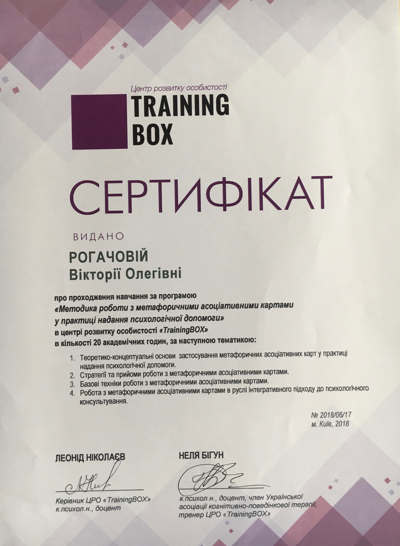 - Курс «Методика роботи з метафоричними асоціативними картами у практиці надання психологічної допомоги» у центрі розвитку особистості "Training box"