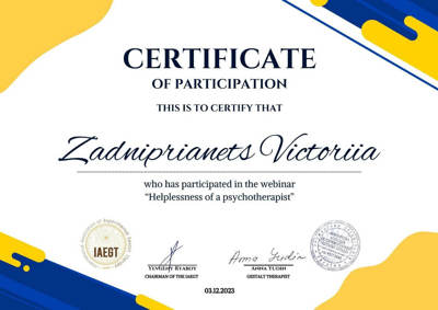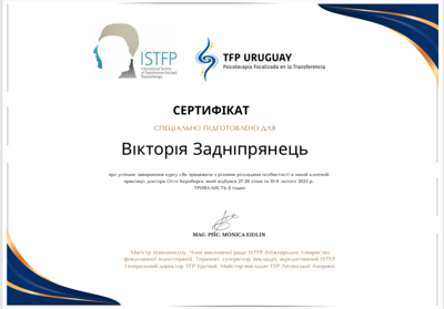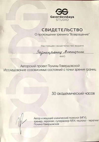 28 років особистої та групової терапії.Тепер Живу Своє Життя,яке стало більш якісне.Психотерапія допомогла мені реалізовувати моі мрії. Тепер я знаю як допомогти моїм клієнтам в темах,які я вже опрацювала у власній психотерапії.