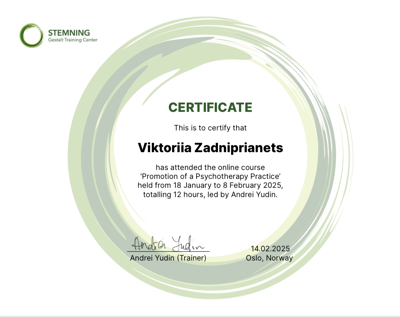 Працюю онлайн. Сесія триває 60 хвилин. На першій зустрічі проходить знайомство терапевта і клієнта, обговорюємо запит та очікування від терапіі.