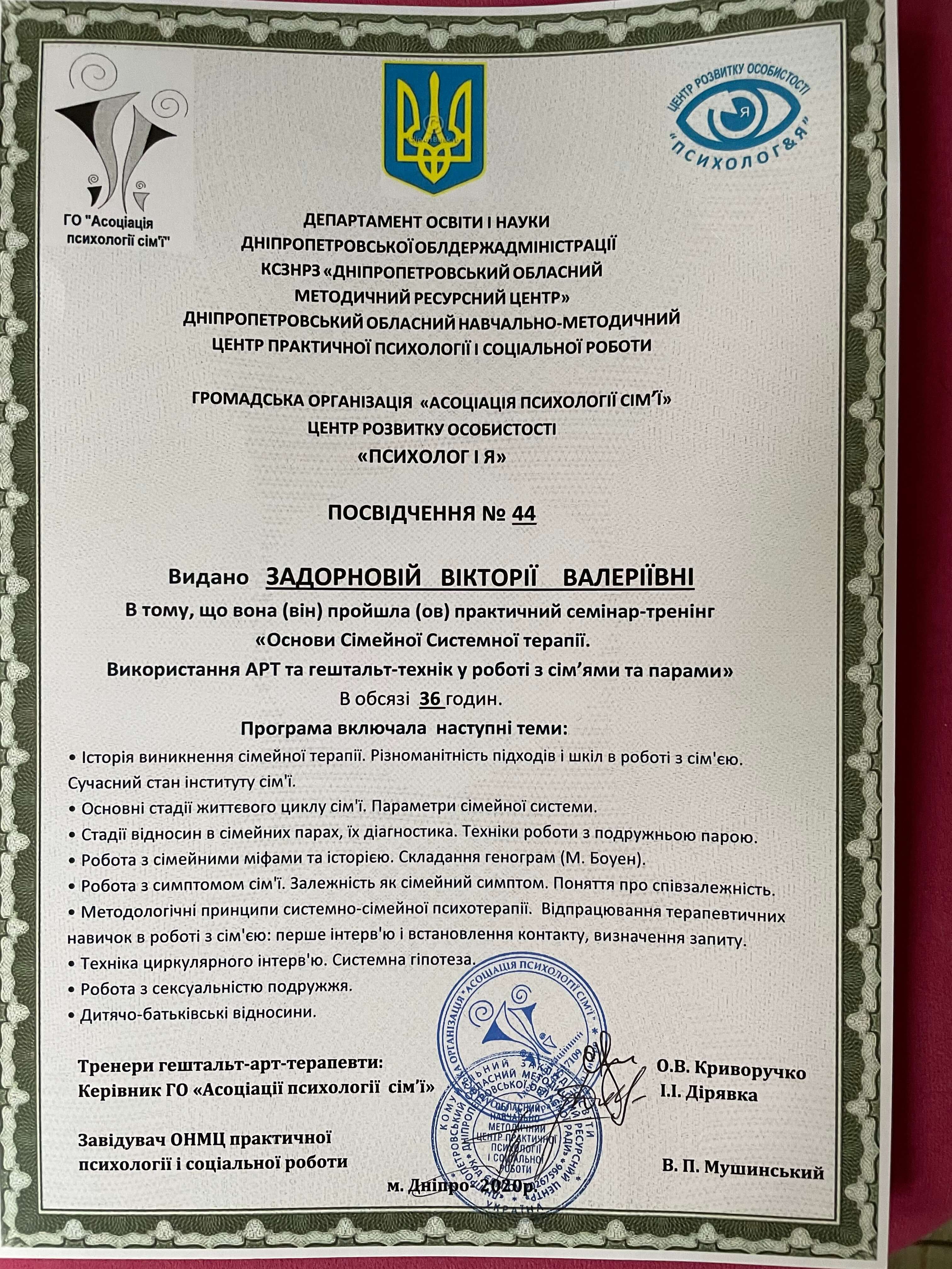 Сертифікований спеціаліст з психосоматичних розладів.