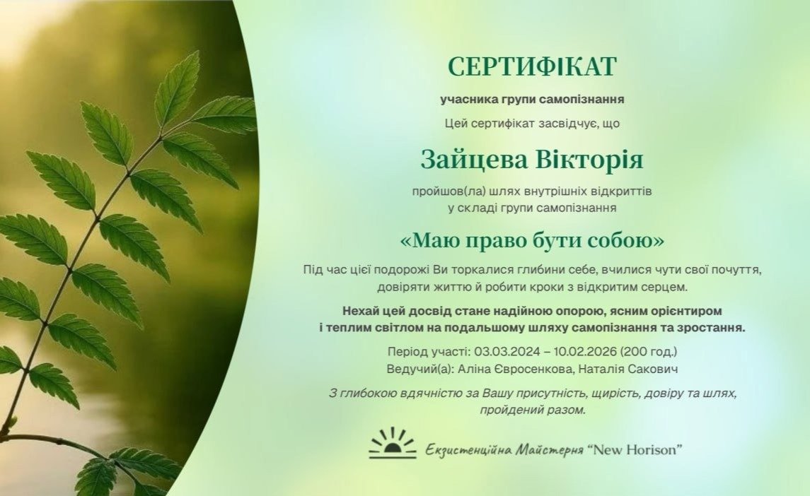 Травень 2022 - серпень 2022р. Психотерапевтичні зустрічі жіночого клубу "Жінка. Всесвіт в середині мене". Форма: очна. Зустрічі типу ретрит. Я була учасником групи.