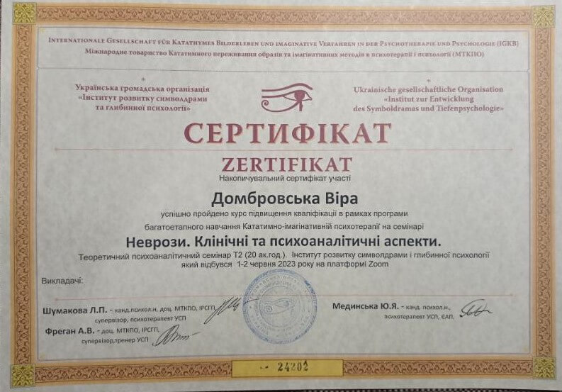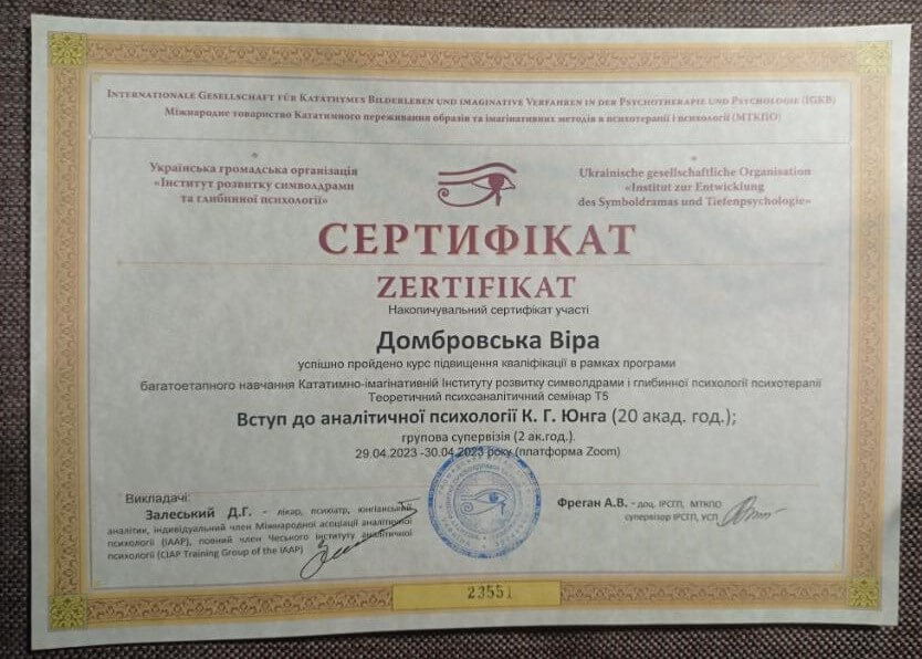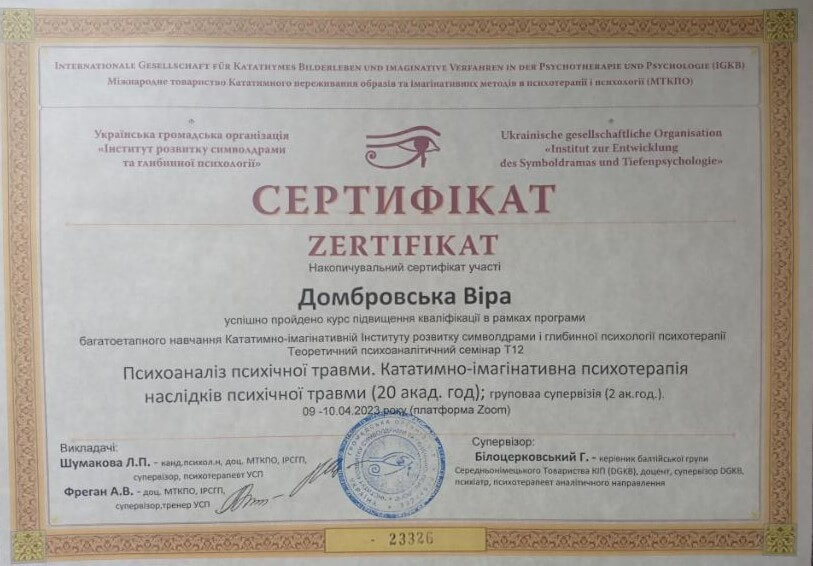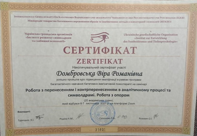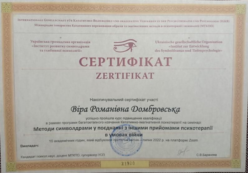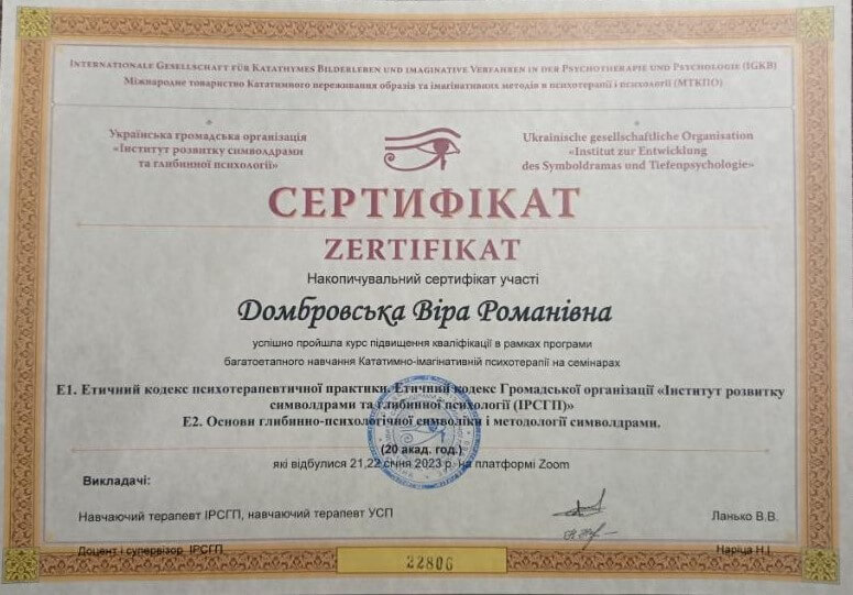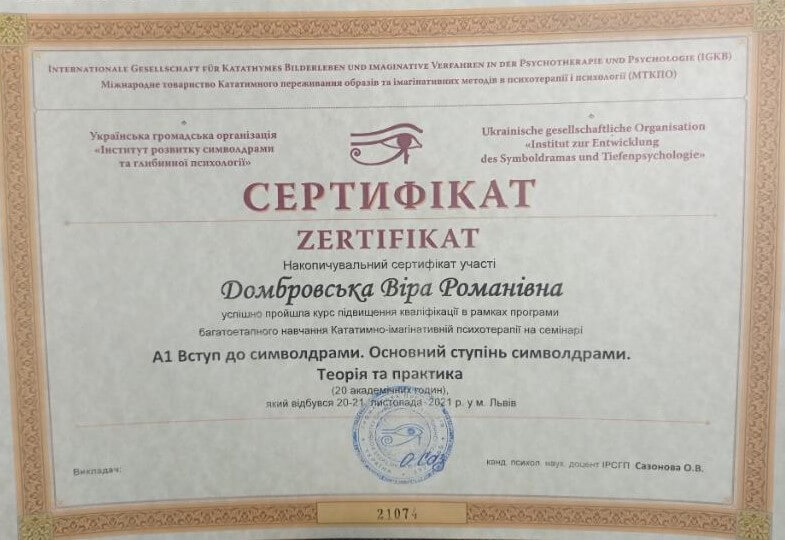Запрошую в терапію дослідити себе, свої способи взаємодії зі світом, свої реакції, емоції, думки, ресурси. Працюю в методі символдрами – психодинамічному методі психотерапії.