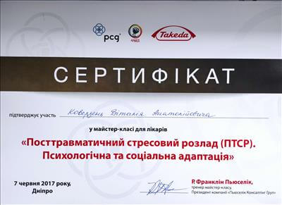 Тренінгові програми: Френк П'юселік "Робота з запобіганням Пост Травматичного Стресового Розладу (ПТСР). Наталія Спенсер PTSTA-P-ЕАТА (УАТА) "Робота з травмами та горінням". "Терапія взаємин: сімейна, подружня та парна терапія".